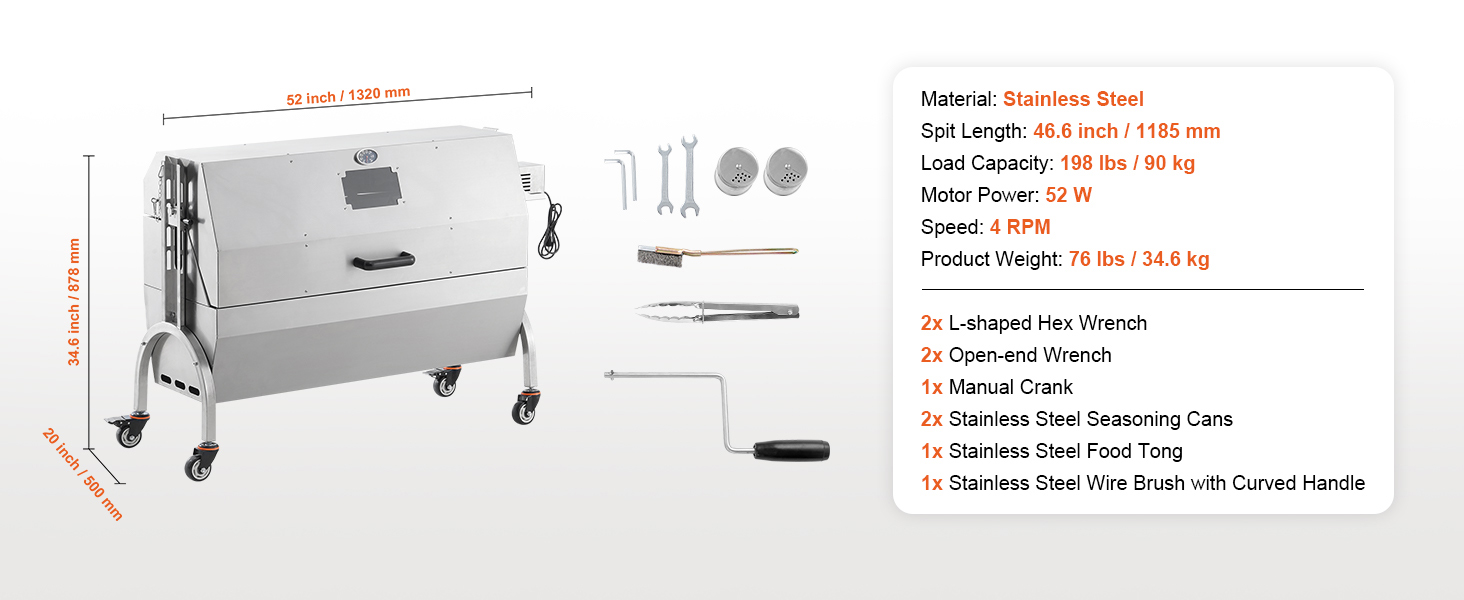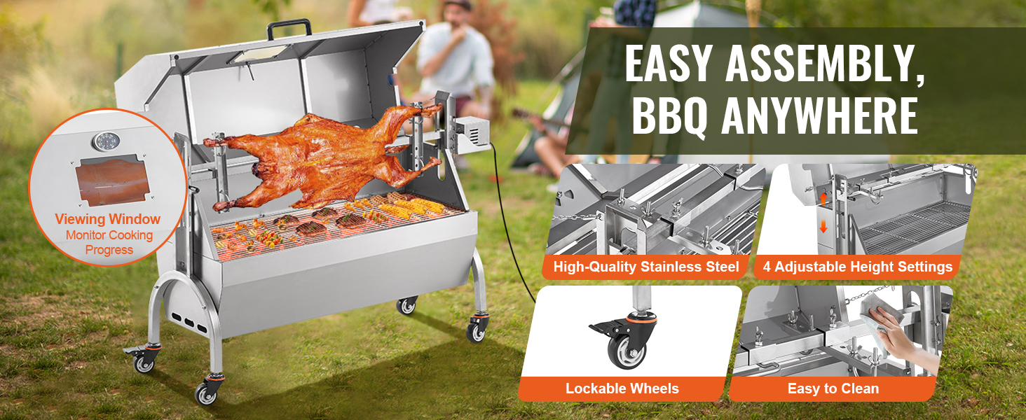 User-Friendly Design: The stainless steel rotisserie roaster comes with 4 detachable and lockable wheels, making it easier to move and providing more stability while cooking. Additionally, it includes 2 seasoning bottles, tongs, and a brush, making it the perfect grill for open flame and rotisserie cooking. The covered design includes a viewing window, allowing you to monitor the cooking status of your food at any time, adding to its convenience.