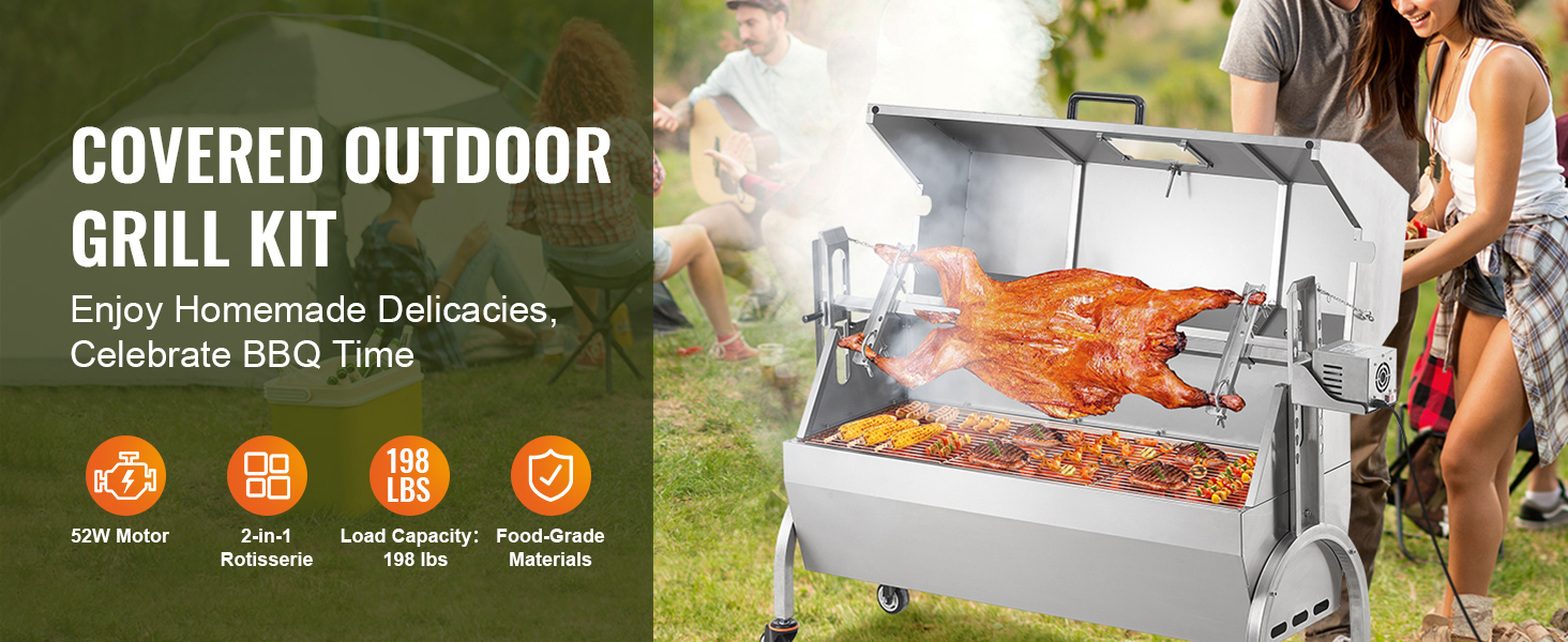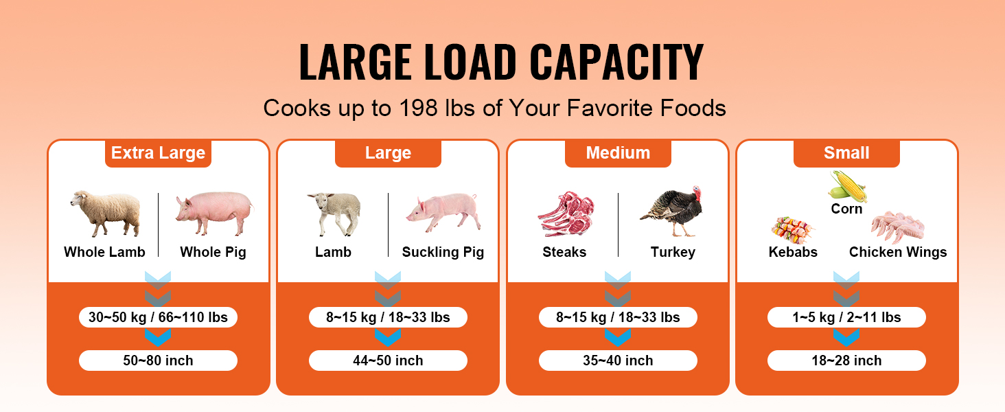 This rotisserie grill kit can rotate loads up to 198 lbs, making it ideal for roasting whole animals. Choose the appropriate grill net for various meats, offering plenty of space for all your needs.