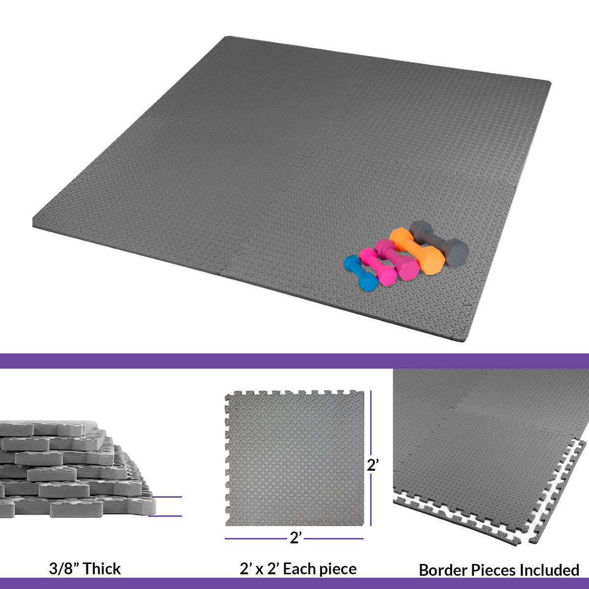 Xspec's Interlocking EVA Flooring Mats are constructed from durable, and non-toxic, eco-friendly EVA foam which is perfect for trade shows, daycares, kitchens, gyms, garages, basements, home fitness rooms and swimming pools. Each kit comes with (25 pcs) 24" x 24" x 3/8" interlocking padded tiles for a total of 100 sq ft of coverage. These are a great addition to your home gym and provides you with a comfortable spot to do floor exercises such as gymnastics, tumbling, wrestling, yoga, and more! The interlocking system easily locks and comes apart, so you can easily move it around to wherever you'd like.