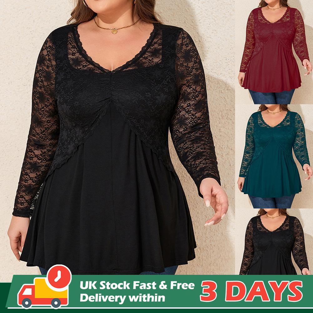 • Womens Lace V Neck Sleeve T-Shirt Tops Ladies Short Sleeve Long Sleeve Blouse US