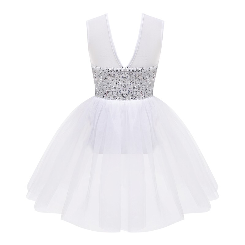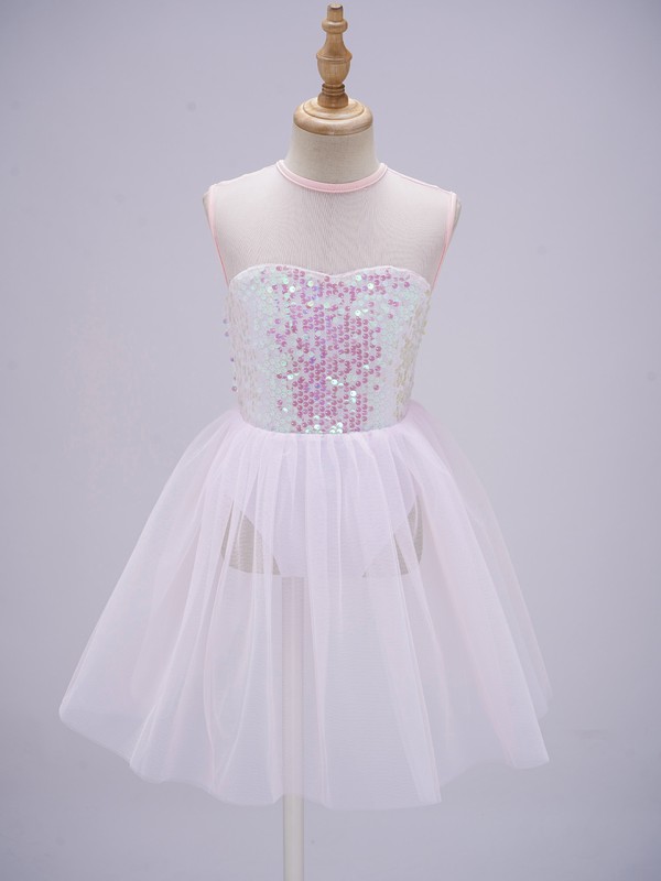 Sleeveless, shiny sequins adorned, mesh patchwork, leotard dance dress.