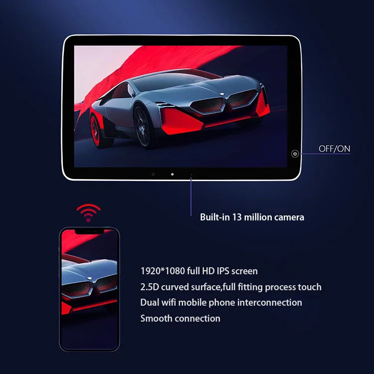 Specifiction: 1.13.3 inch G+G tempered glass 5 point touch screen. 2.Latest android 12.0, eight-core, Cortex-A55 high speed processor.RAM3G, ROM32G. 3.Multiple Choices for endless entertainment: Bluetooth-compatible,FM transmitter ,digital tv box,phone mirroring , Google search , You Tube , play games...etc. 4.Support multiple languages: such as English, Chinese, Spanish, German, Russian,Portuguese, Arabic, Korean, Japanese, Dutch, Hindi, etc. 5.Ultra-thin design,as thin as 5.8 mm. 6. Adjustable Viewing Angles: easy and safe to install,without damage original car cable.The bracket can be adjusted up and down . 7.Two monitors are working independently. 8.Built-in 13 million pixel camera and microphone for video conference and video call. 9.Built-in 2.4G and 5.8G wifi module, making phone mirror-link smoother. 10.Support 4G internet ,stable signal transmission.