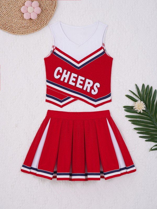 2Pcs Kids Girls V Neck Sleeveless Letters Cheers Print Vest and Pleated Skirt Set Outfit.