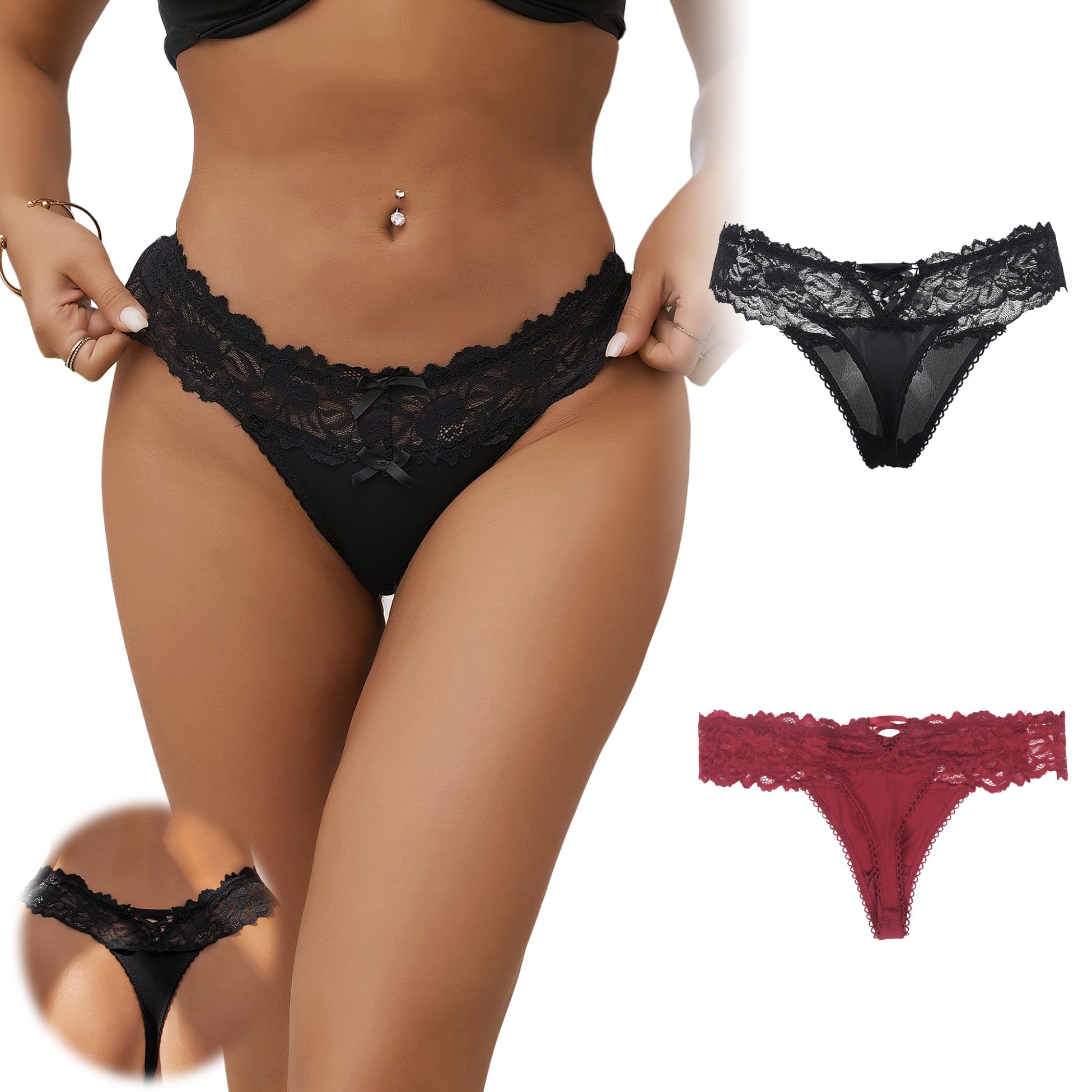 T-back thong panties are made of smooth silhouette lace, the lace is soft and stretchy, it won't scratch your skin at all, you can wear them with any type of bottoms (leggings, jeans, skirts, etc.)