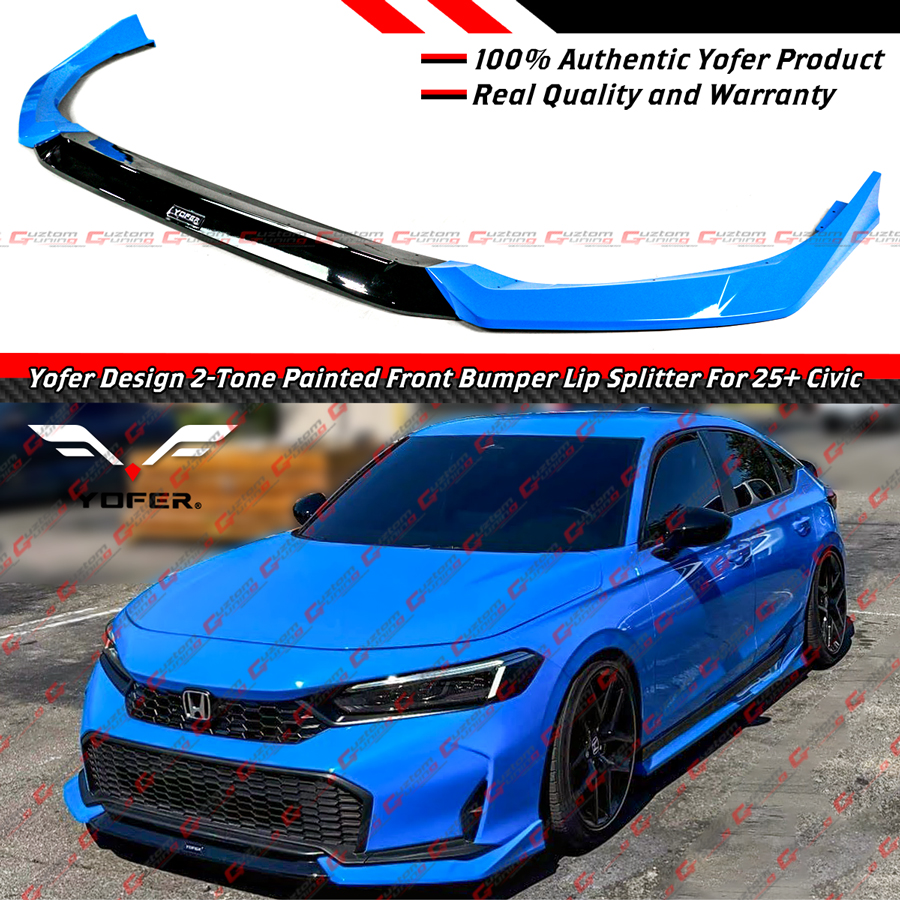 - Yofer Design 3 Pieces Special 2-Toned Painted Front Bumper Lip Splitter Kit For 2025 and Up Facelifted Civic (2 Pieces Side Splitters + 1 Piece Central Lip Splitter). The Kit Comes With Yofer Logo Decal and It Has An Indent In The Middle For You To Put The Decal.