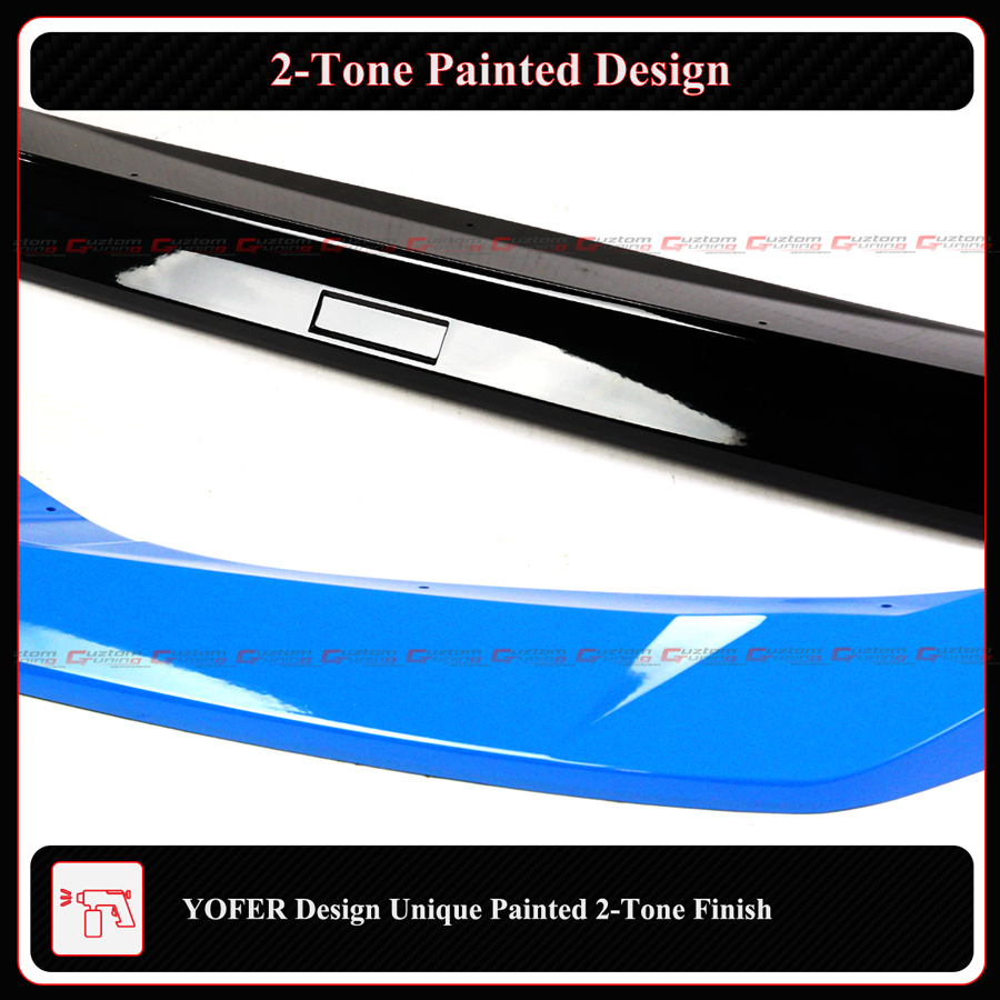 - The 2 Side Splitters Are Painted in Boost Blue While The Middle Lip is Painted in Glossy Black Finish. Please Note That The Paint On The Lip Is Aftermarket Painted. They Are Not Factory Code Match Paint. Color May Not Be 100% But It Is Very Close.