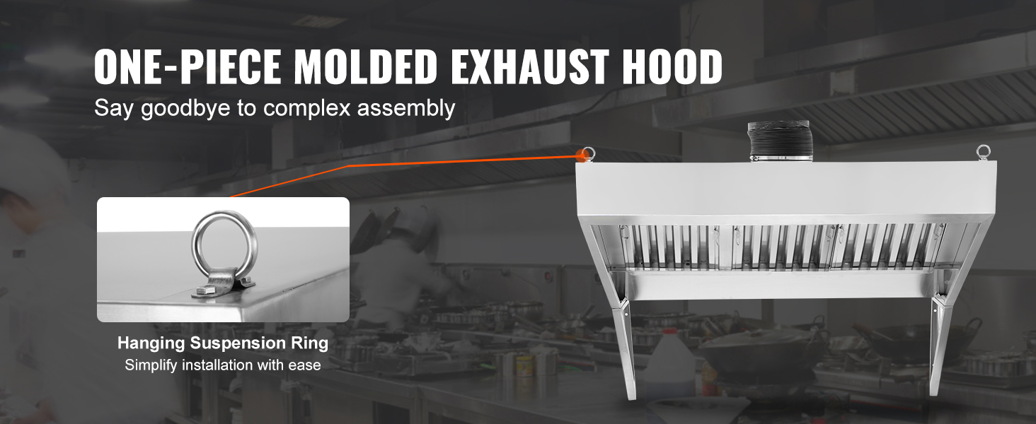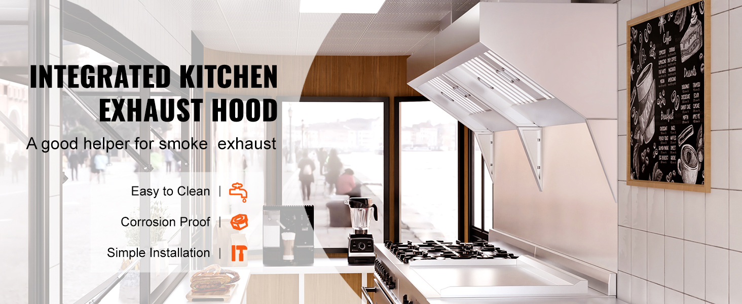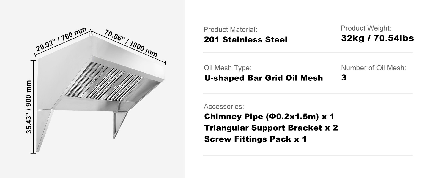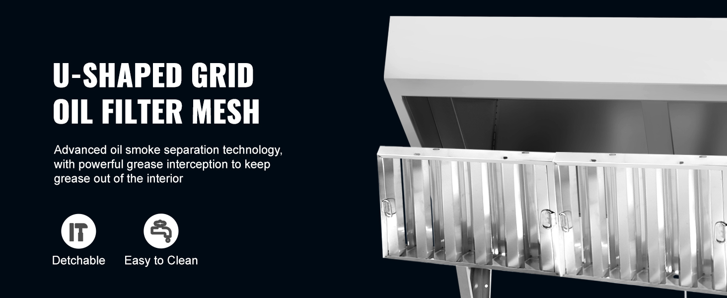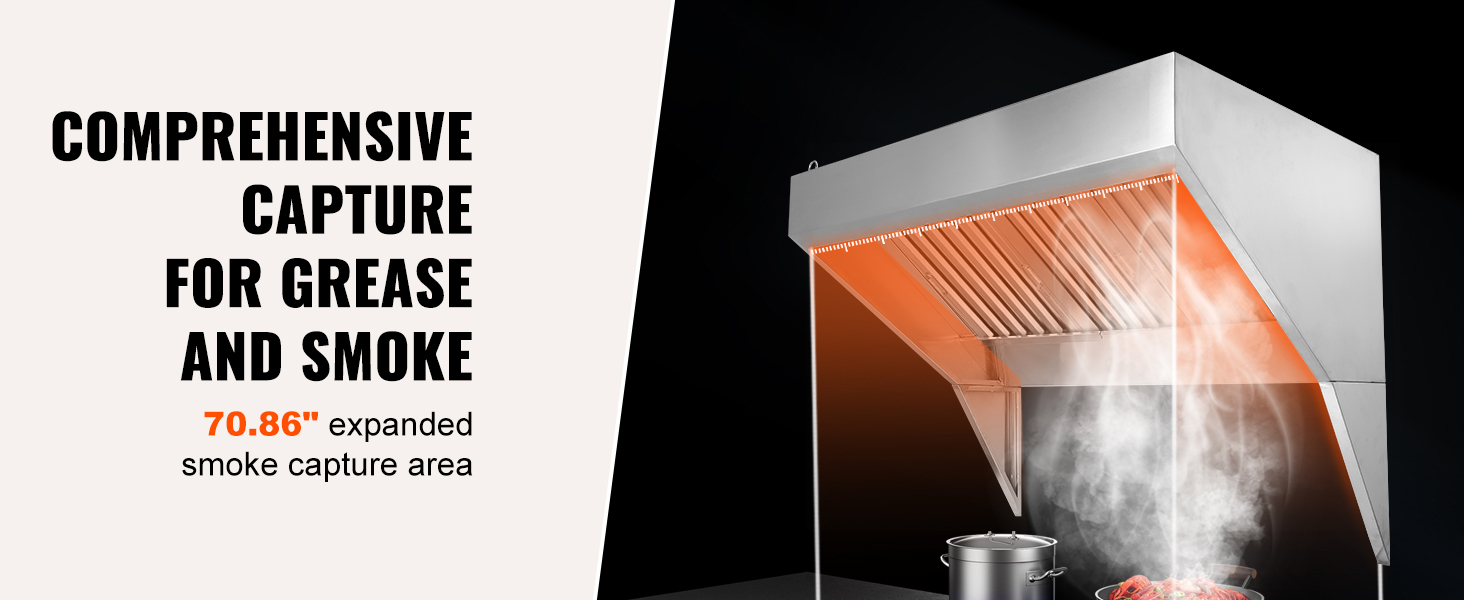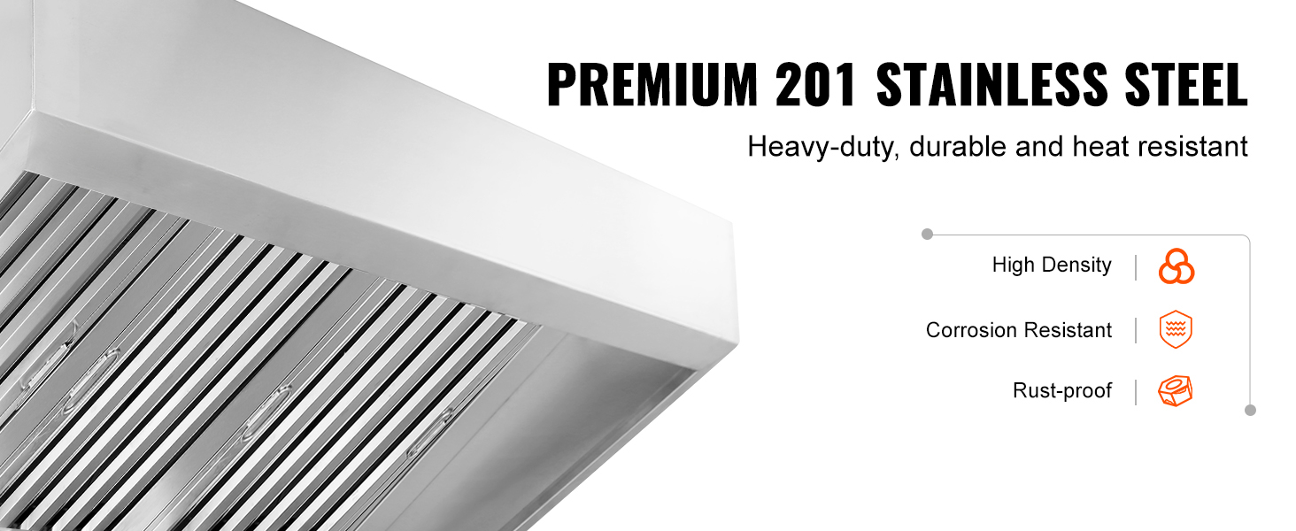 VEVOR 201 stainless steel commercial exhaust hood, optimized for easy cleaning, installation, and performance. Paired with 70.86-inch large smoke capture area and upgraded U-shaped grid oil filter meshes, it can effortlessly eliminate smoke and odors to keep your culinary space fresh and clear!