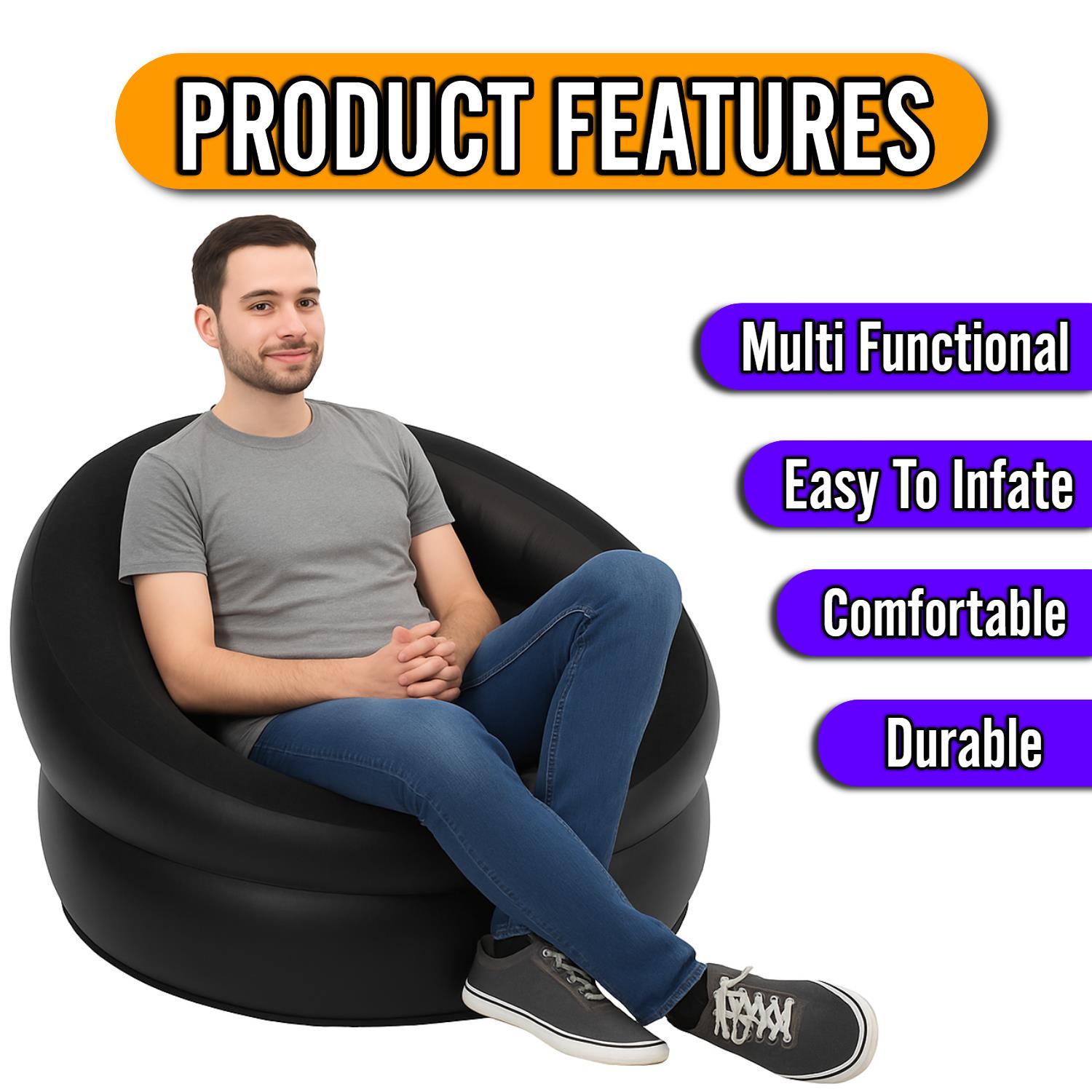 Upgrade your lounging experience with our stylish and ergonomic Single Inflatable Chair Sofa. Perfect for any space, this chair blends comfort, convenience, and modern aesthetics, making it an ideal addition to living rooms, dorms, bedrooms, patios, and more.