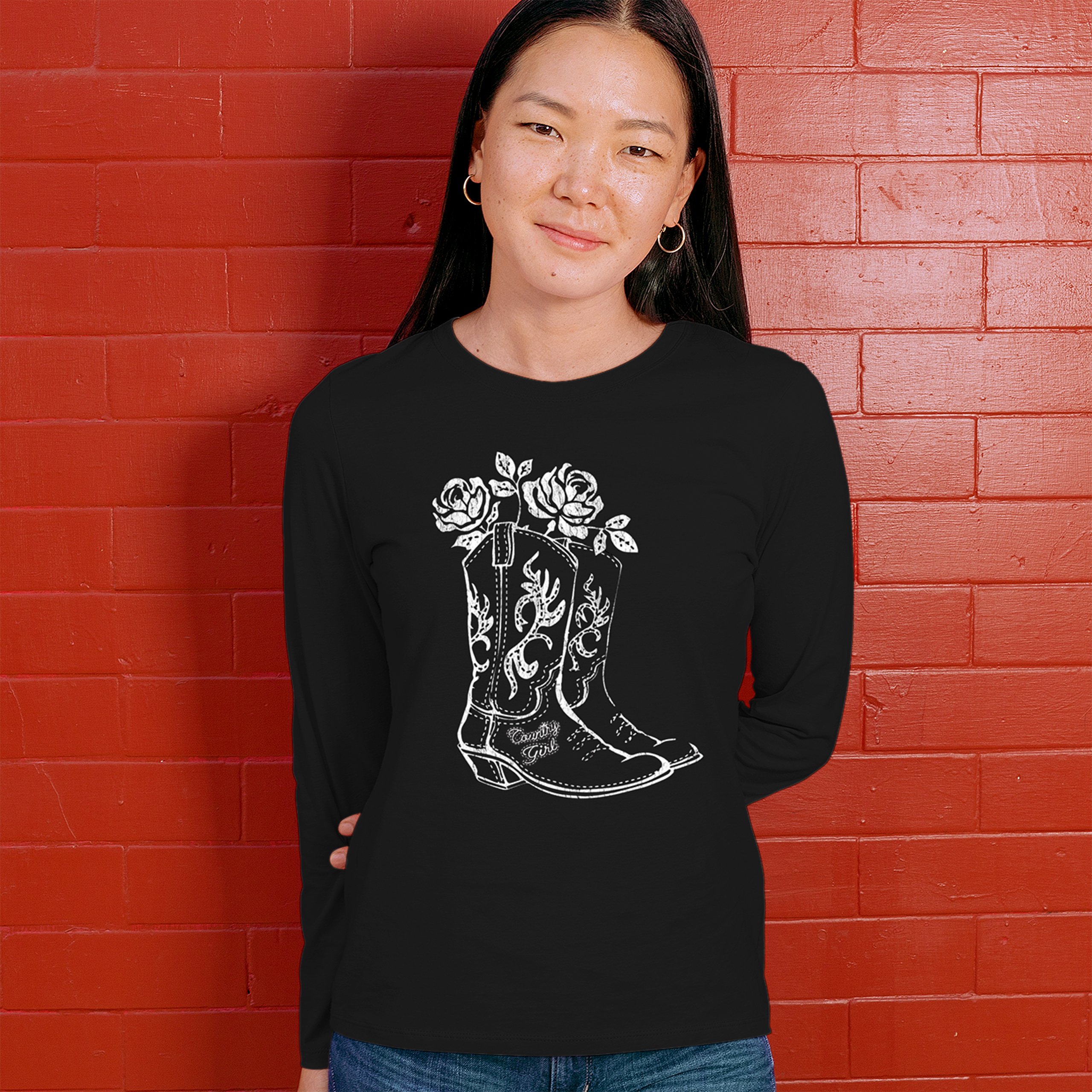 Country Girl Boots Women's Long Sleeve T-shirt Vintage Cowgirl Western Floral