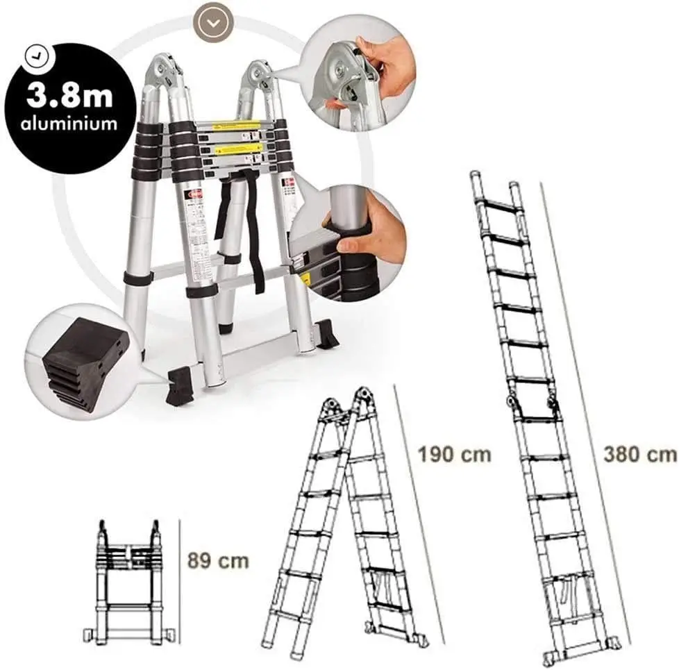 Escalera A Escalera telescópica con marco 3,8 m (1,9 m + 1,9 m) Escalera telescópica de aluminio Multiusos 150 kg/330 lbs Capacidad de cargaCaracterísticas:
