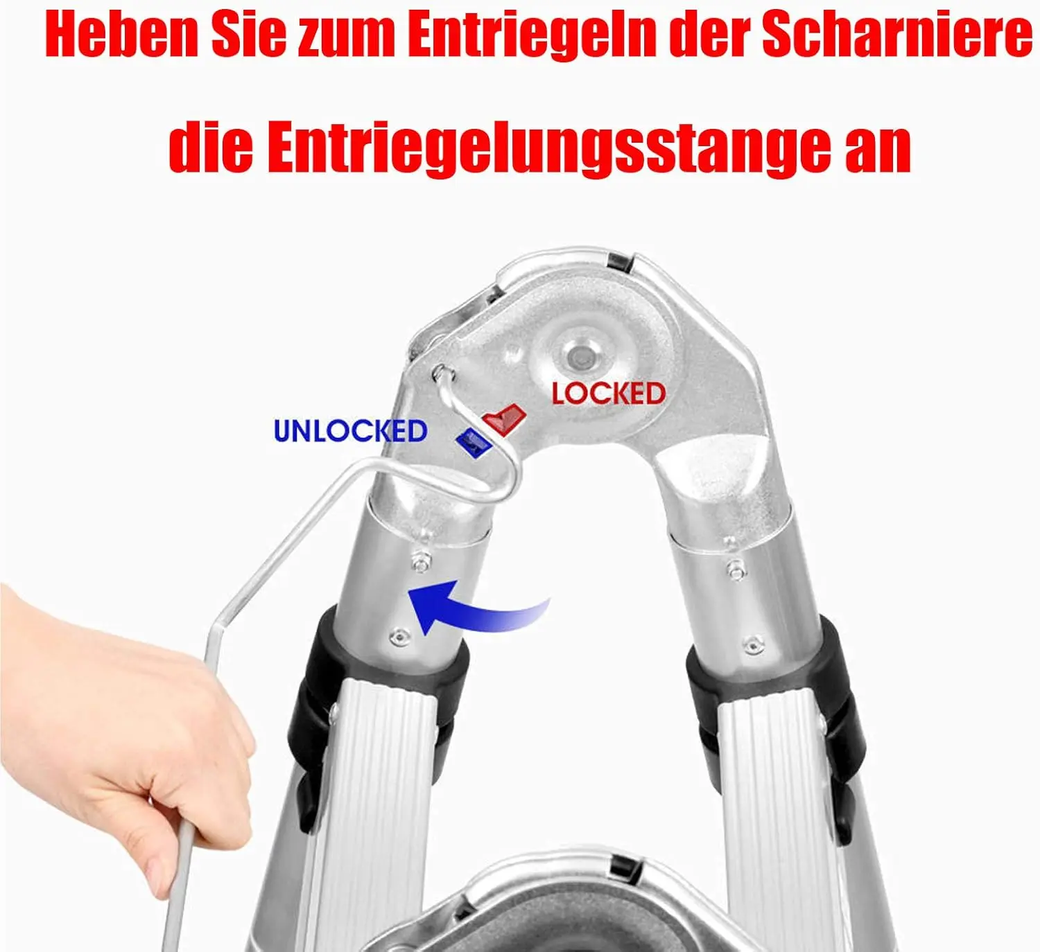 ◆ Primero extienda la escalera a la altura que desee y luego gírela en un marco A (asegúrese de que la bisagra y la varilla de liberación estén bloqueadas).