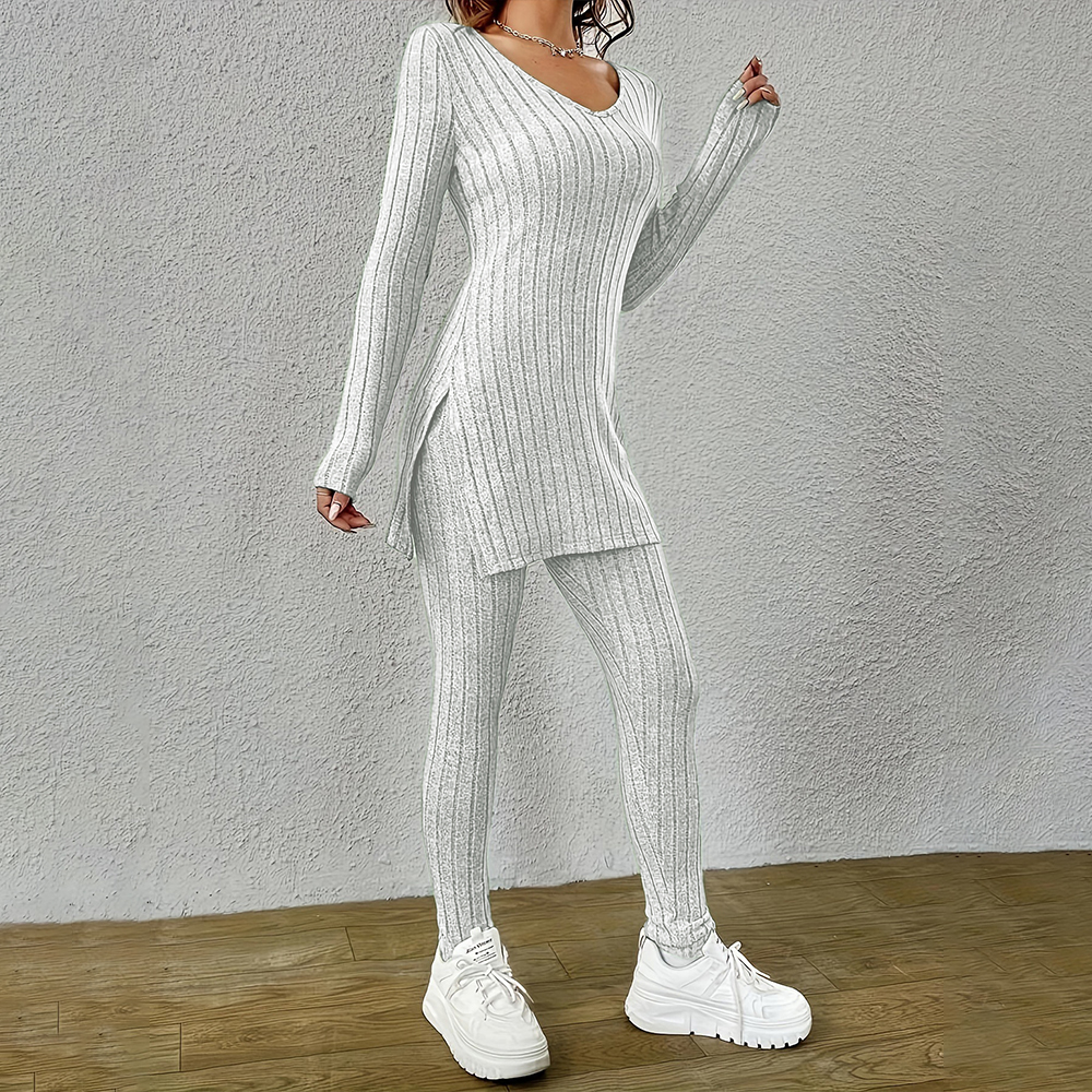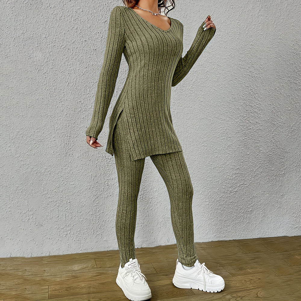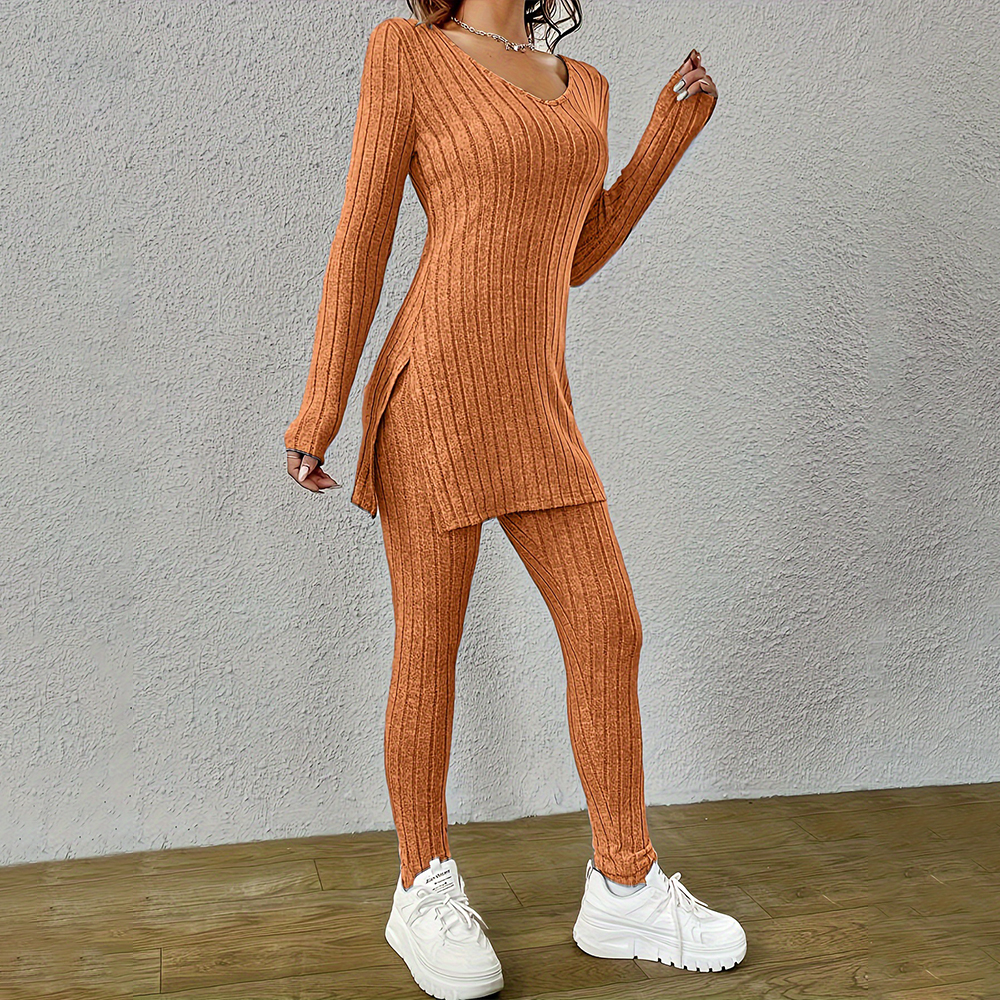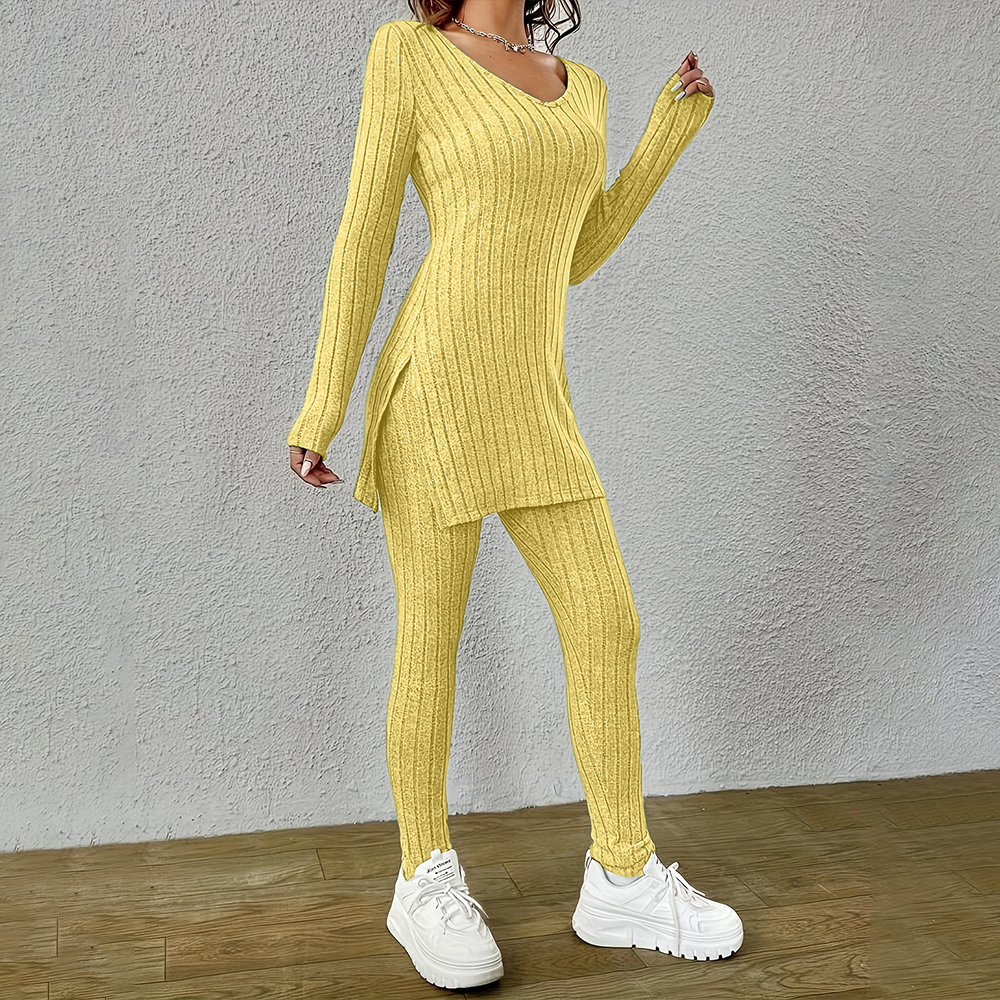 • Autumn Womens Pullover Long Sleeve Solid V Neck Knitted T-shirts Casual Pant Set