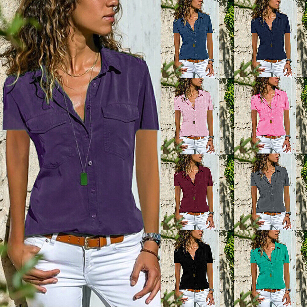 • Women V-Neck Short Sleeve Button T shirt Ladies Floral Casual Tunic Tops Blouse