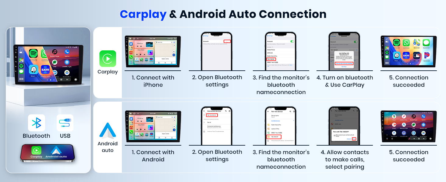 ●Wireless carplay& Android auto:Users can safely make calls, send messages, play music and use navigation without having to manually operate their phones, thus focusing on driving. Simple and intuitive interface, designed for driving scenarios, ensuring a high degree of driving safety.
