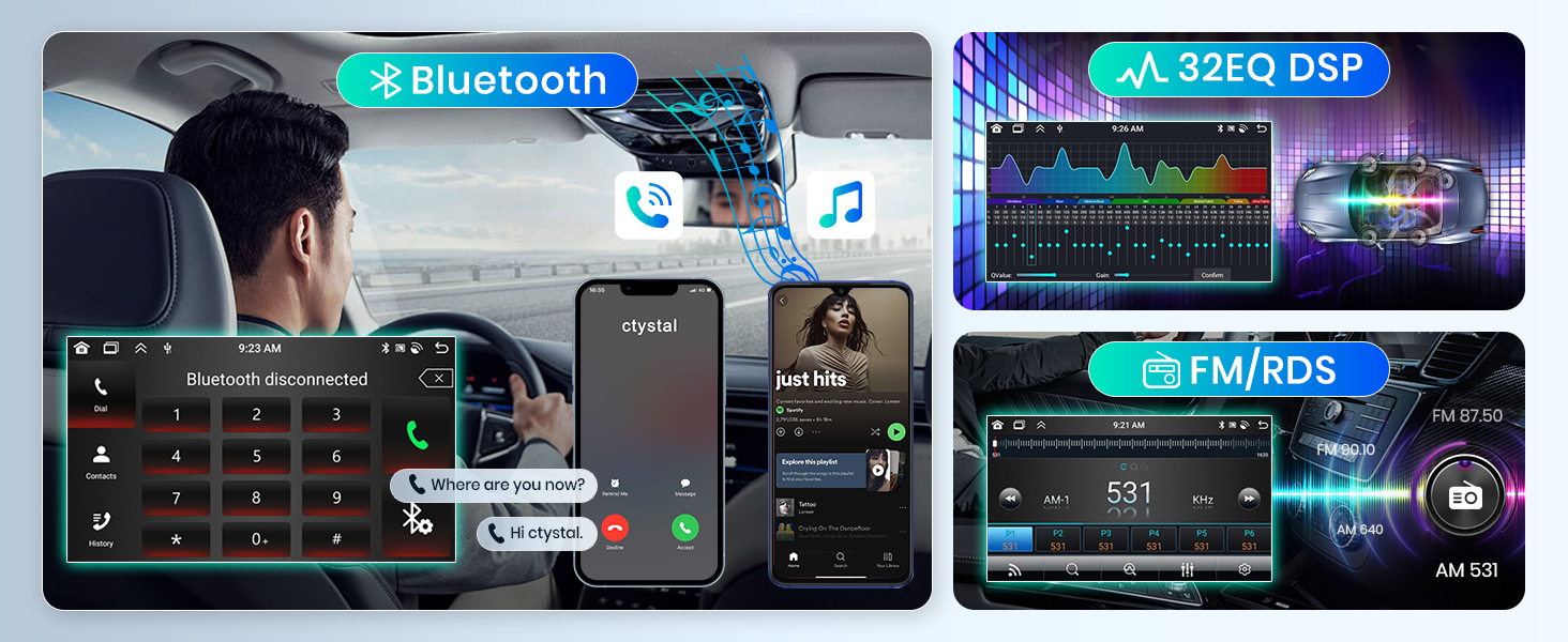 ●FM/RDS radio: supports high-quality audio reception and intelligent data transmission, bringing users a full range of broadcast experience.It not only provides a clear audio experience, but also enables users to obtain news, music, traffic information, etc. at any time during driving through intelligent interaction functions, thus improving travel convenience and safety.