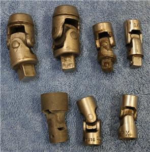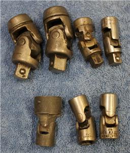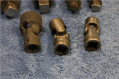 Here I have a mixed lot of wobble tools: there are THREE 3/8" drive wobble sockets (all 12-point sockets) including a 1/2" Proto (this one is about worn out and may have to be tossed), a Bonney 1/2", and a Wright 3/4" (I believe this one is an impact socket, too). There are also FOUR wobble adapters -- two each in 3/8" drive (one of which is marked 1/2", but I can't figure out why -- it's 3/8" male to 3/8" female -- that one is a Speedmaster; the second one is just marked BM) and two each in 1/2" drive (and these two are generics -- I can't find a brand marking anywhere on them). These are generally in good, used condition (with the exception noted above), and certainly could use a bath in the parts washer, but certainly all serviceable tools!
