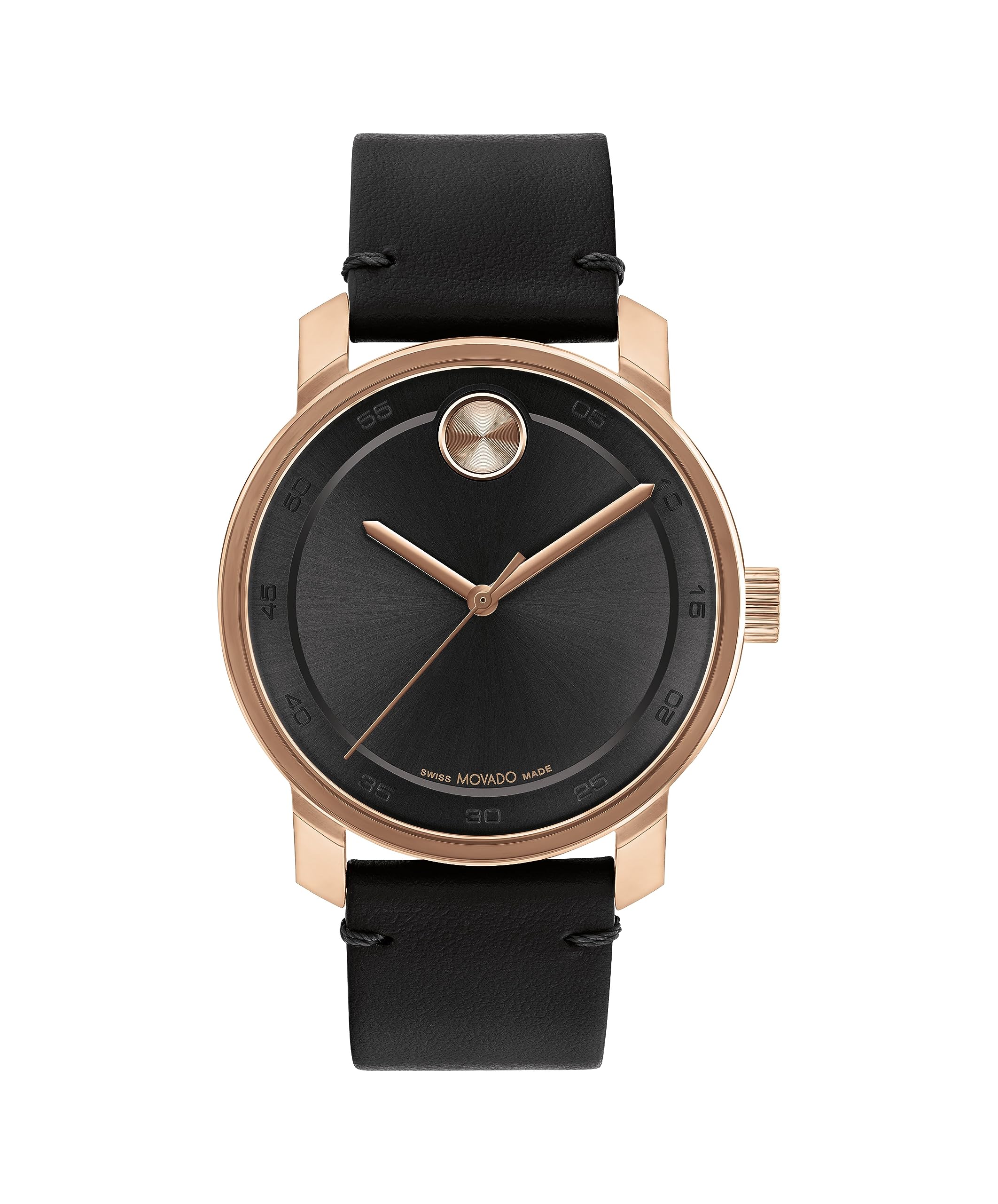 • Resilient Design: Men's Movado Bold Access, Ionic plated rose gold tone steel case with a black leather strap, black Museum dial with flat dot.