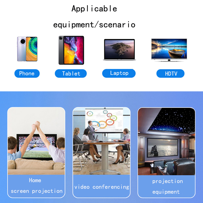 Applicable equipment/scenarios: mobile phones, tablets, laptops, HDTVs, home screen projection, video conferencing, projection equipment