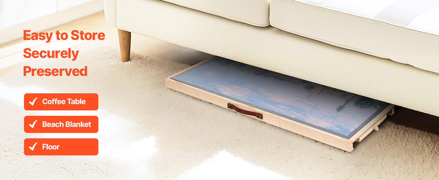 Q: Does this puzzle board accommodate 1000 pieces? A: This puzzle board is designed for standard 1000-piece puzzle sizes. The puzzle area measures 735x535 mm / 29x21 inch, which fits most 1000-piece puzzles. Q: How do I store the puzzle once it's completed? A: The portable puzzle table features compartmentalized storage drawers where puzzle pieces can be sorted. Once finished, it can be folded for storage or covered with a protective lid, allowing it to be displayed as a decorative frame. Q: How stable is the tabletop? A: The tabletop is made from natural pine wood, offering a stable structure that can withstand movement during the puzzle process, keeping the puzzle intact. Q: Is assembly complicated? A: The jigsaw puzzle organizer is designed for immediate use out of the box, making it ideal for camping, travel, and other portable activities.