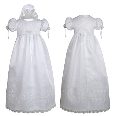 This is a traditional style for baby girl's christening which is made out of fine elegant embroidered fabric. It comes with a coordinated bonnet. It is a perfect choice for your baby.