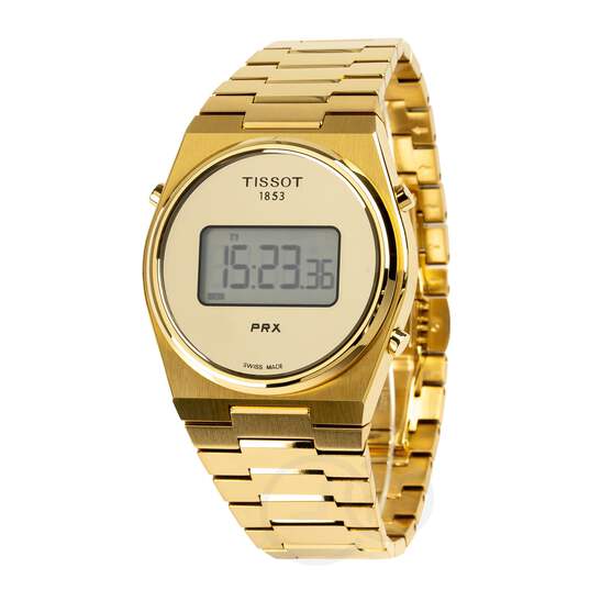 The Tissot PRX Digital Men's Gold Watch boasts a durable 40mm yellow gold PVD-coated stainless steel tonneau case and matching stainless steel bracelet. The golden mirror dial features a modern digital display blending retro aesthetics with contemporary features.