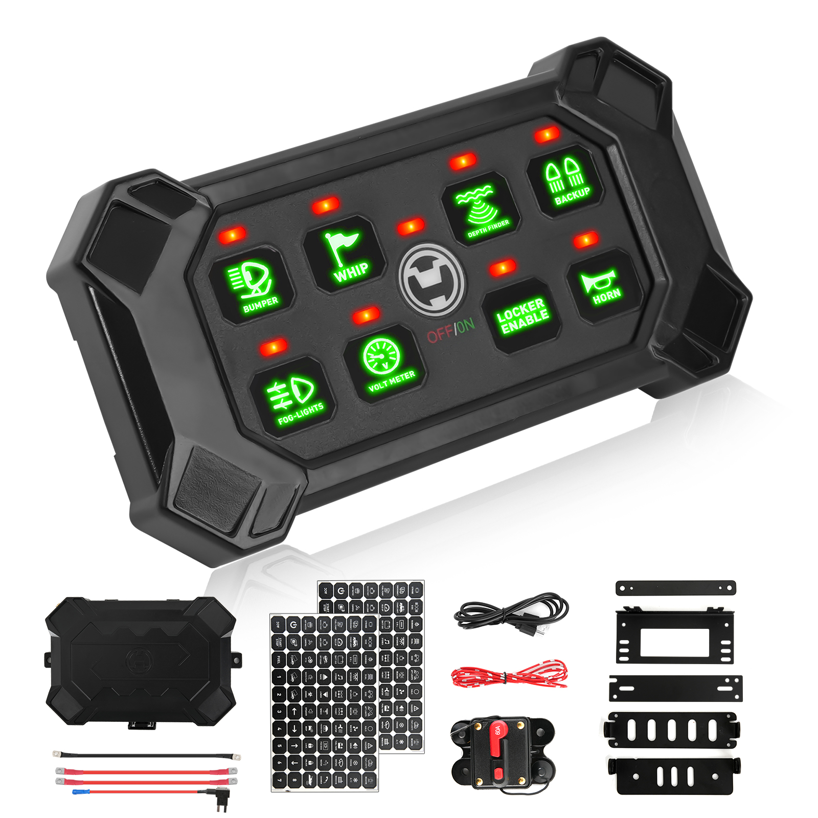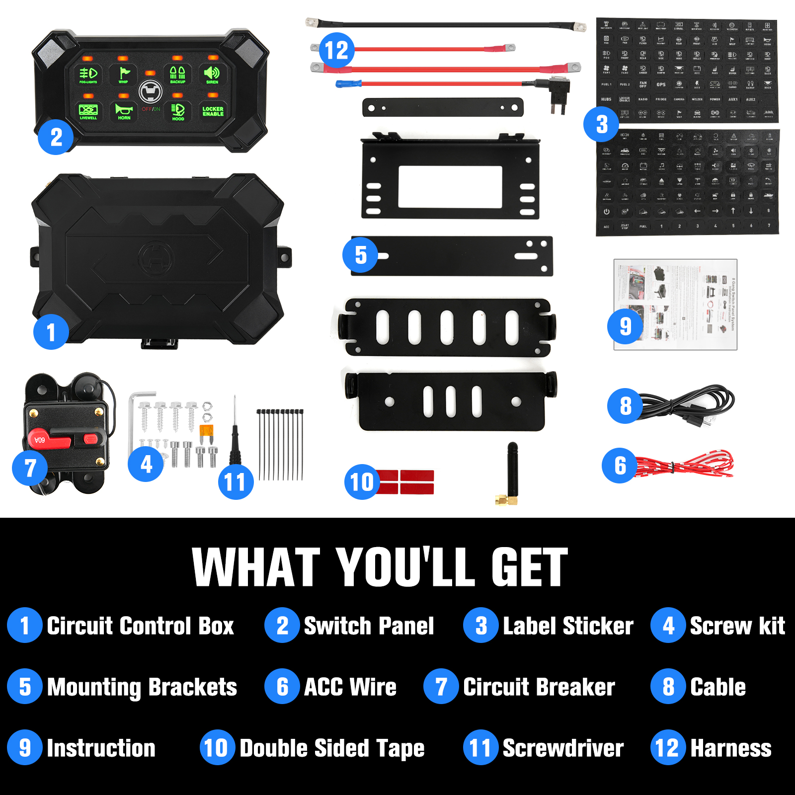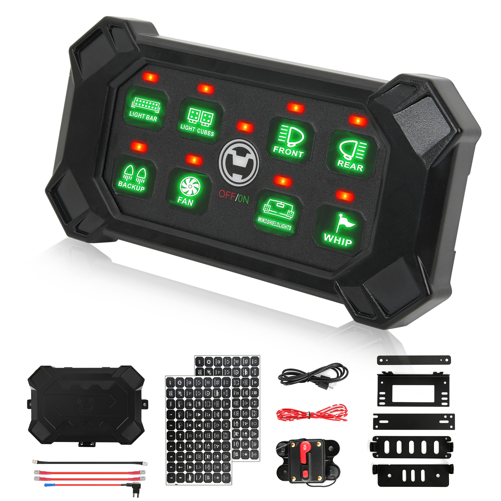 6.What You Get: Switch Panel, holder, control box, mounting brackets and accessories, 5 fuses(30A x2, 20A, 15A, 10A), 140pcs labeling stickers, antenna(with 9.8ft cord), and charging cable. Suitable for RV, marine, car, truck, off-road, ATV/UTV, boat, yachts, caravans, etc.
