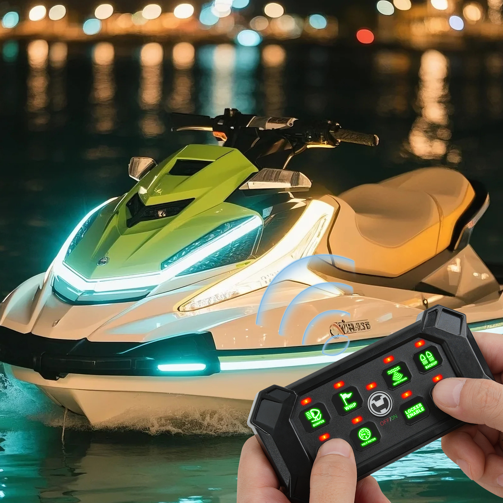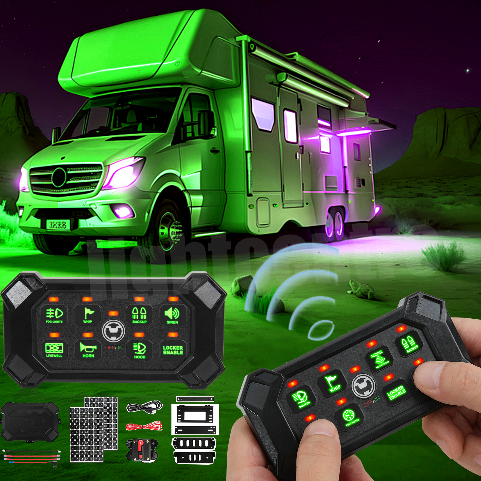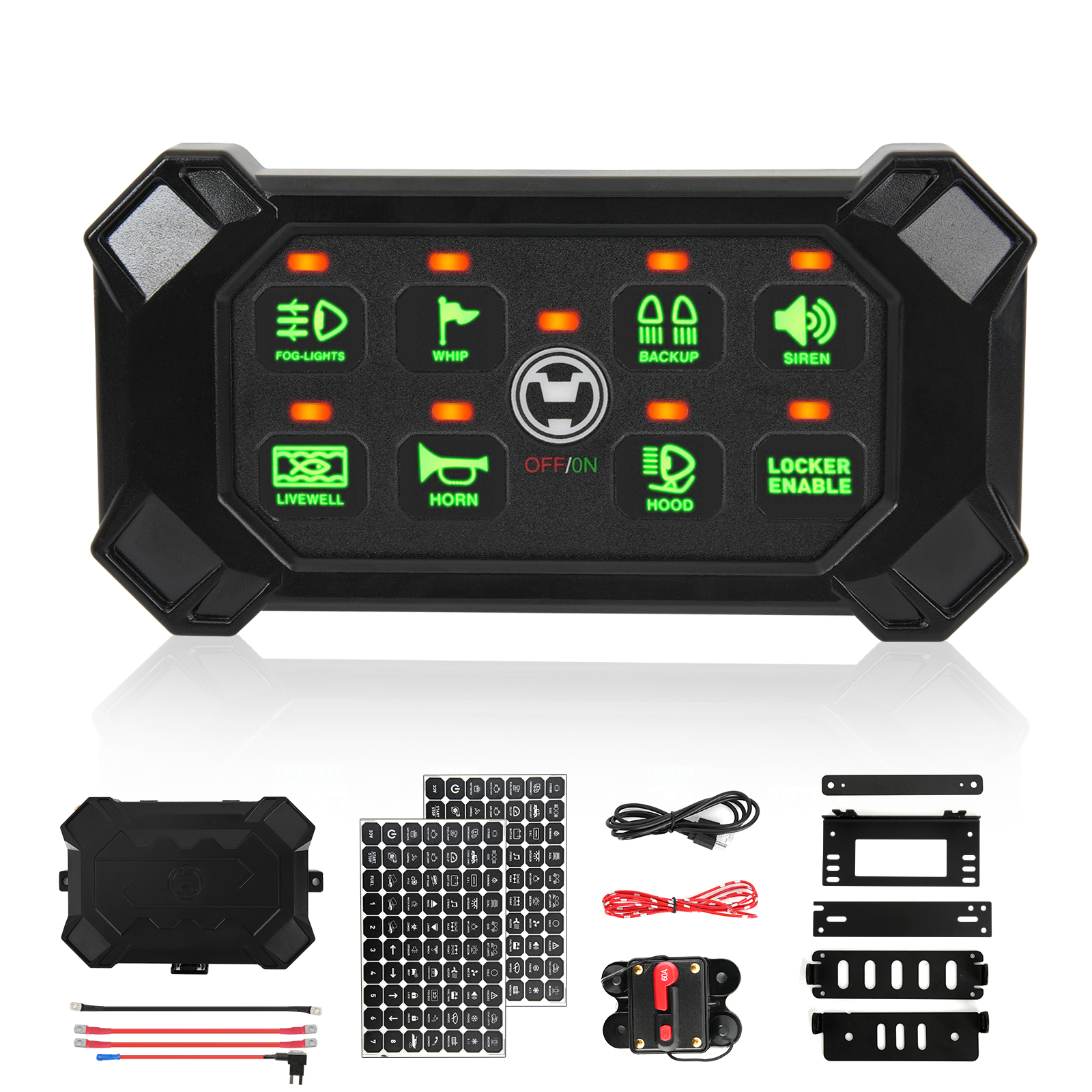 6.What You Get: Switch Panel, holder, control box, mounting brackets and accessories, 5 fuses(30A x2, 20A, 15A, 10A), 140pcs labeling stickers, antenna(with 9.8ft cord), and charging cable. Suitable for RV, marine, car, truck, off-road, ATV/UTV, boat, yachts, caravans, etc.