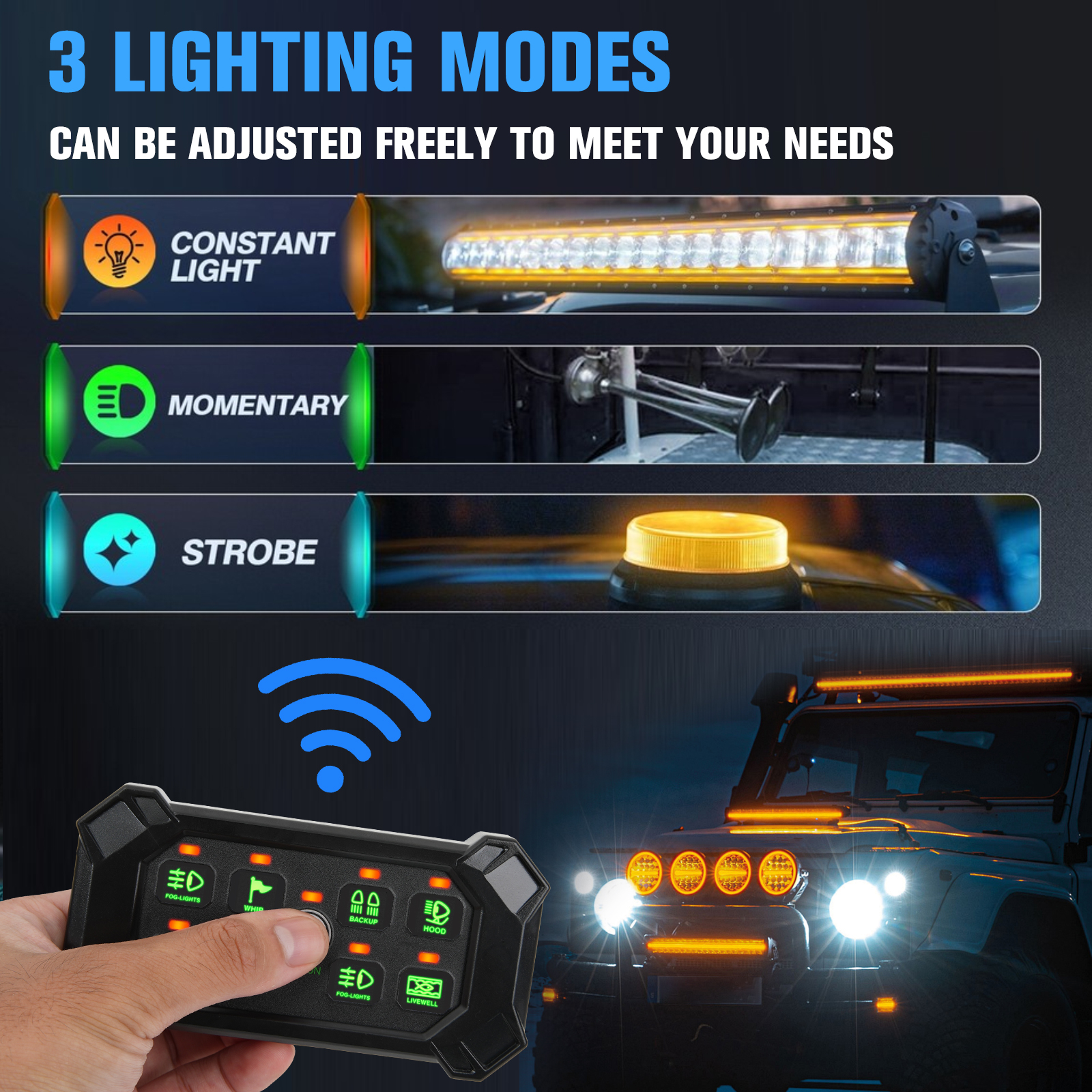 With 8 colors and 3 modes, you can tailor the controls to match your preferences and mood. Whether you prefer a constant, momentary, or strobe mode, this panel has you covered. With 5 levels of brightness adjustment, you can adapt to any environment effortlessly.
