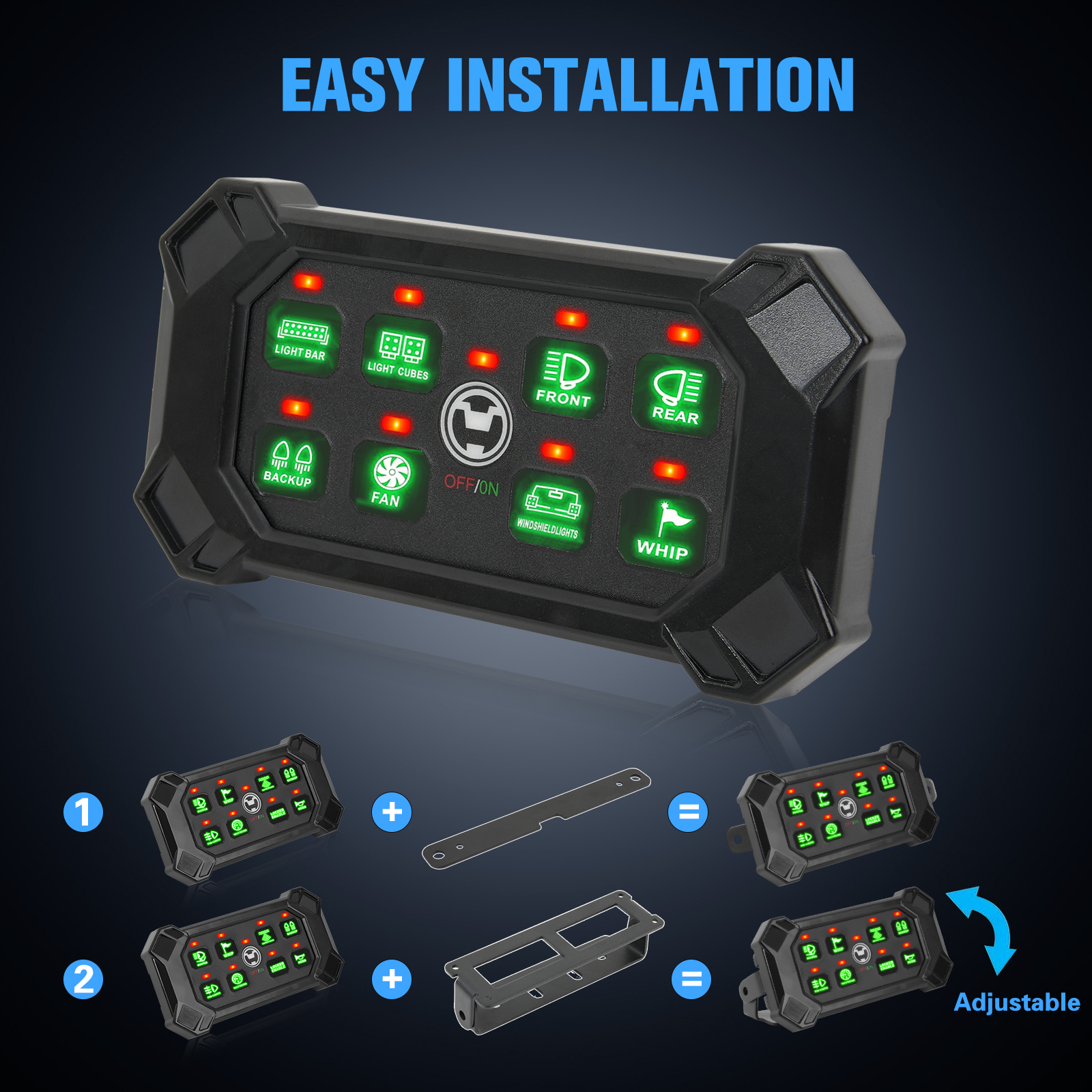 3. Multifunctional & Customizable - Customize device controls per switch: Constant, Momentary Mode & Strobe Mode. 8-Color Options displayed in different Backlight Modes: Gradient/Jump/Breathing. 5 Levels of Brightness to adjust according to the environment. This panel satisfies what you need and how you like it.