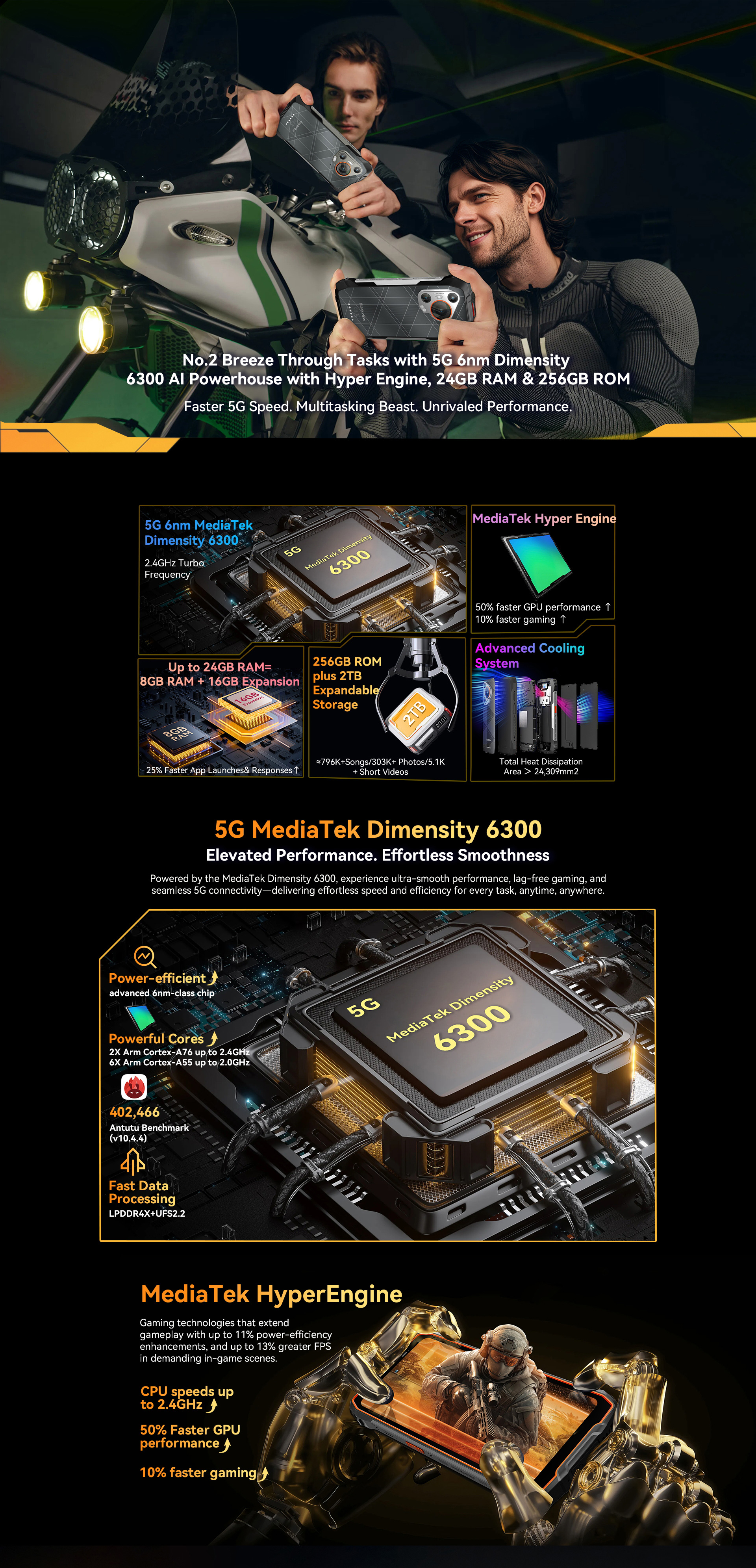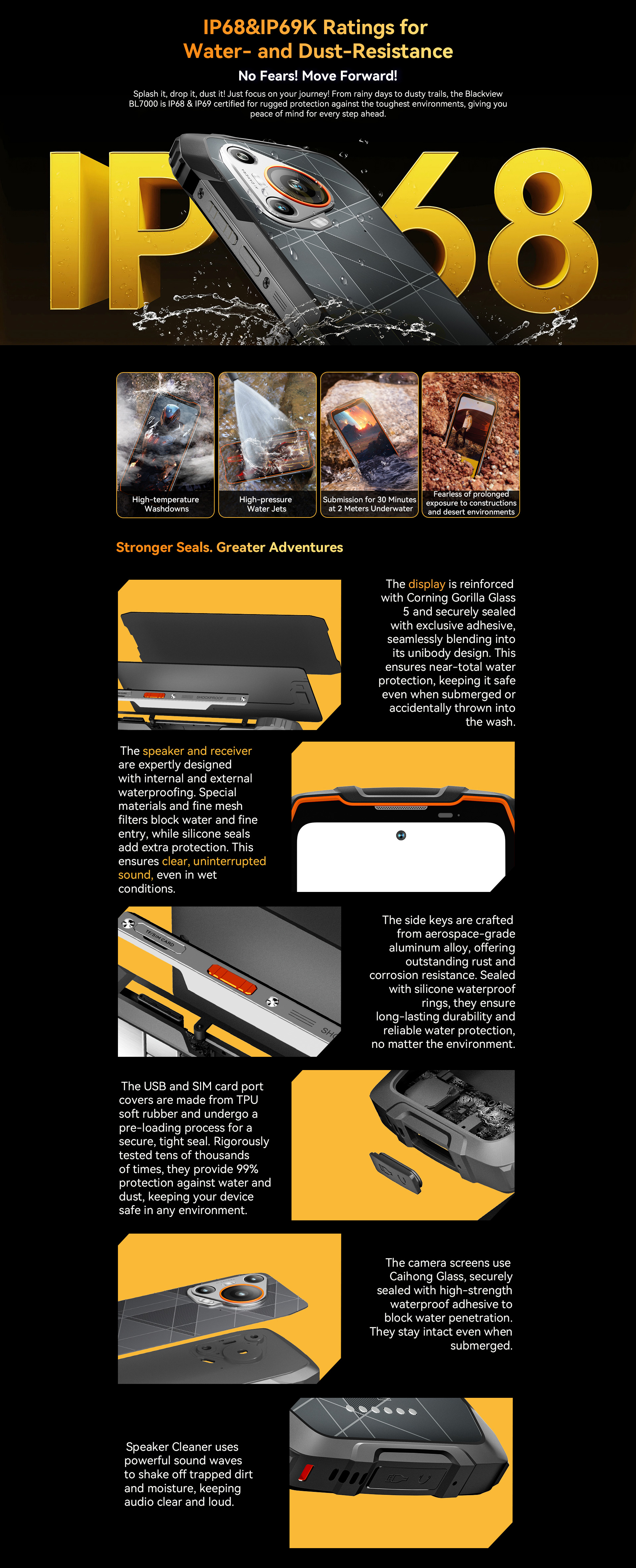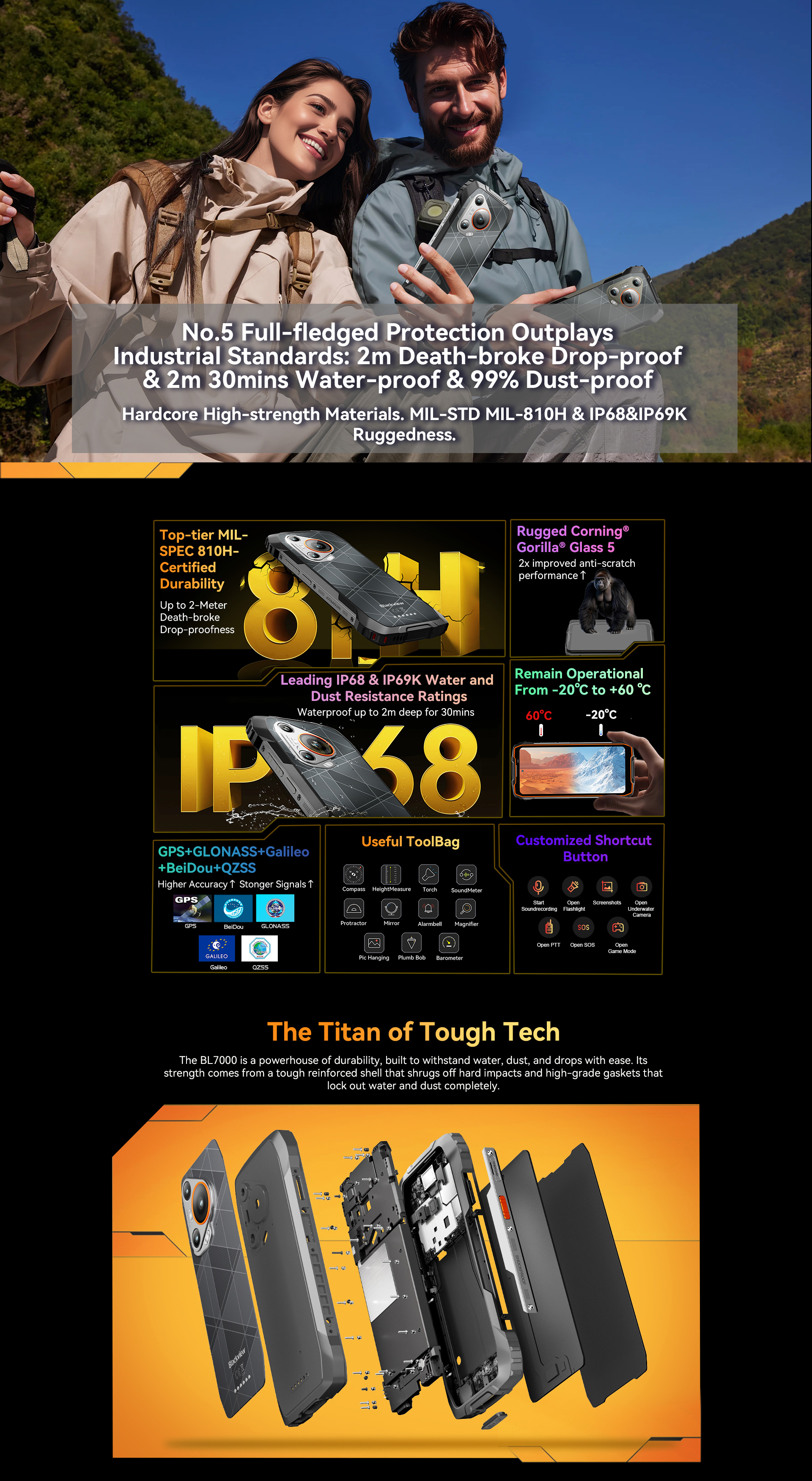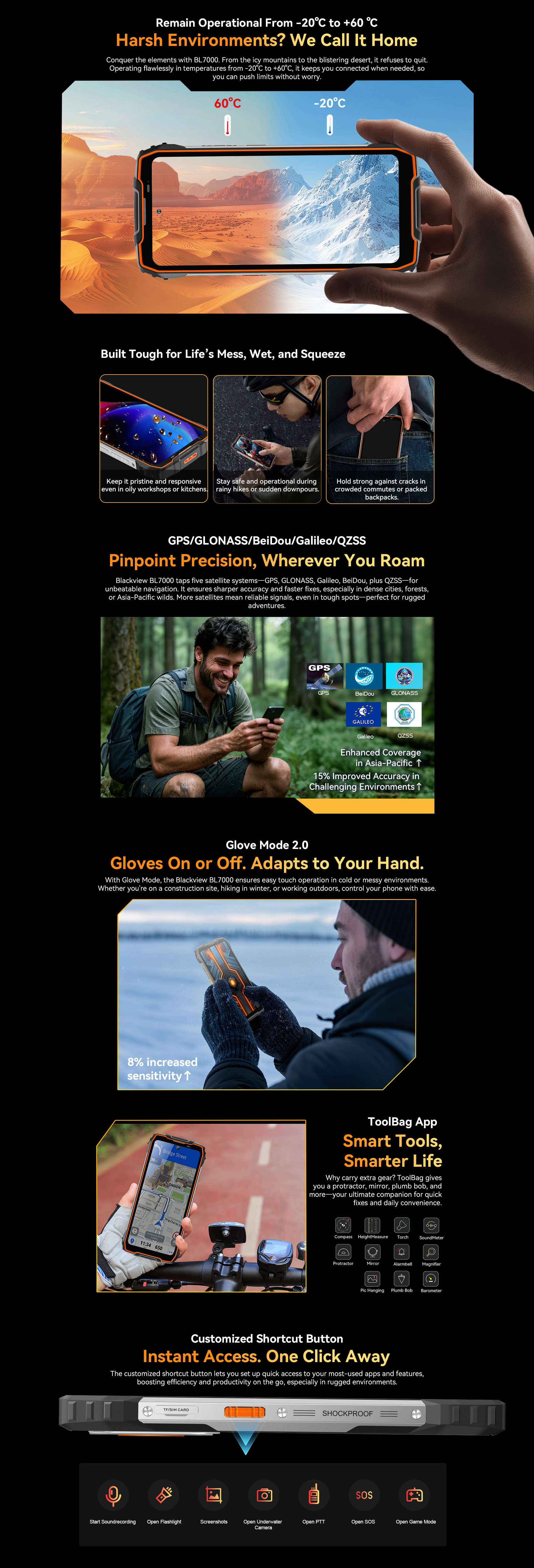 Glove Mode,Operational from -20℃ to +60℃,smart-PA BOX speakers,Face ID & Fingerprint unlock, MIL-STD-810H & Leading IP68 & IP69K Waterproofness, ToolBag utility