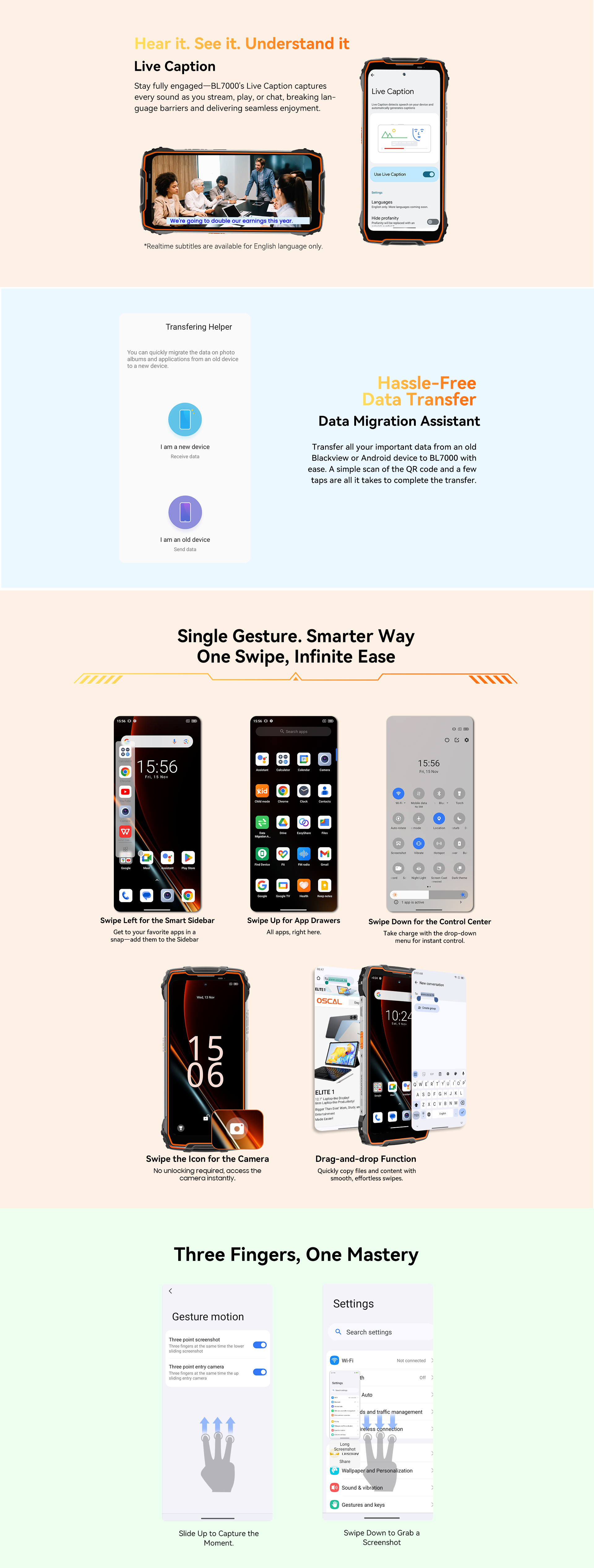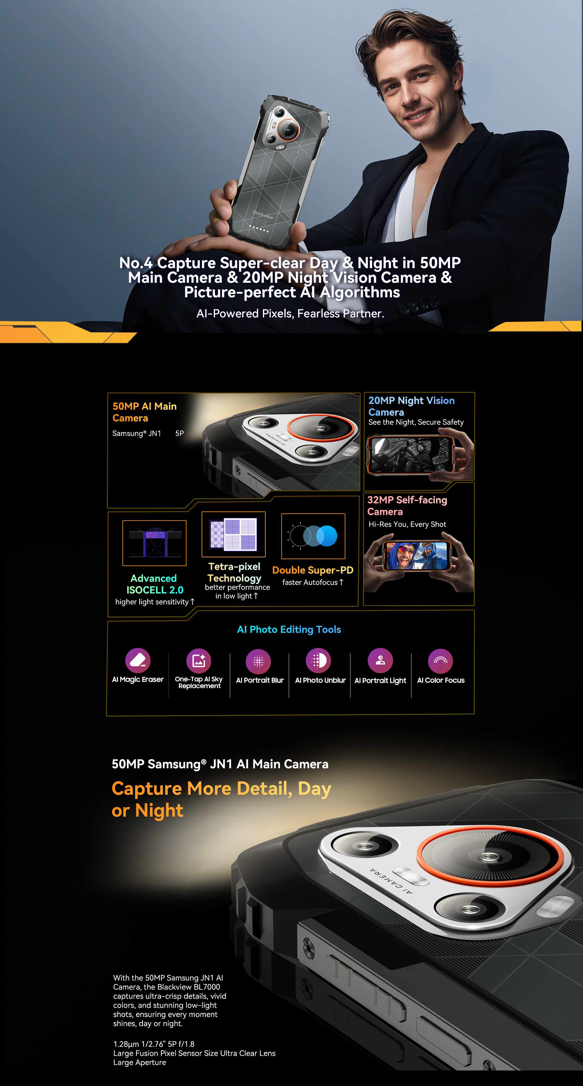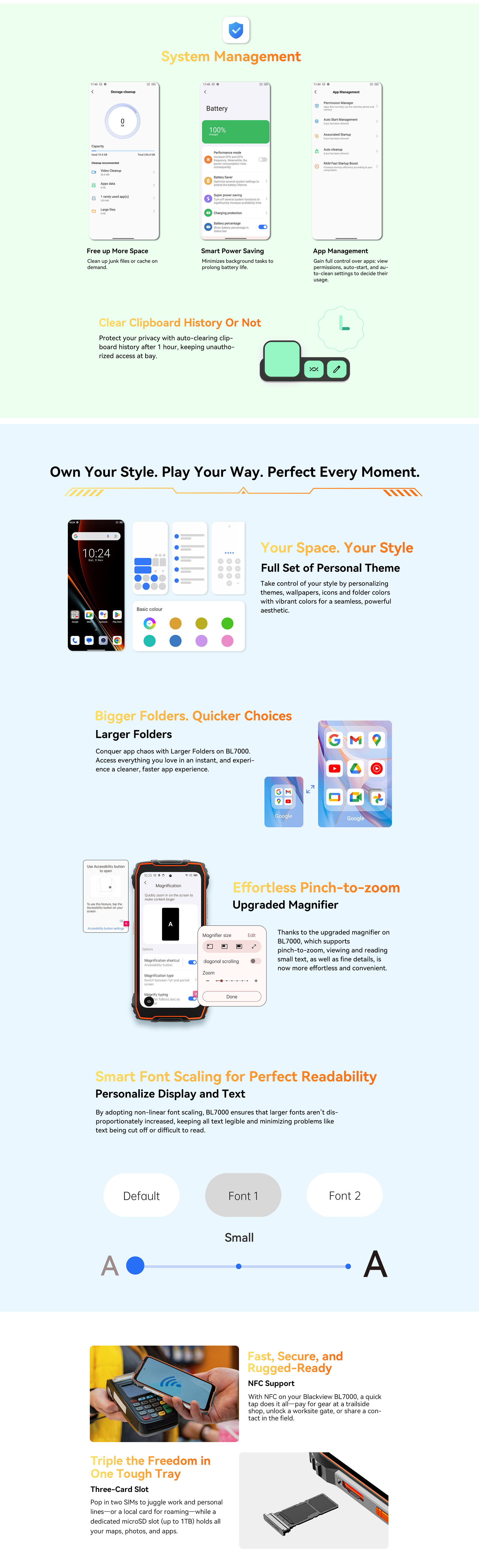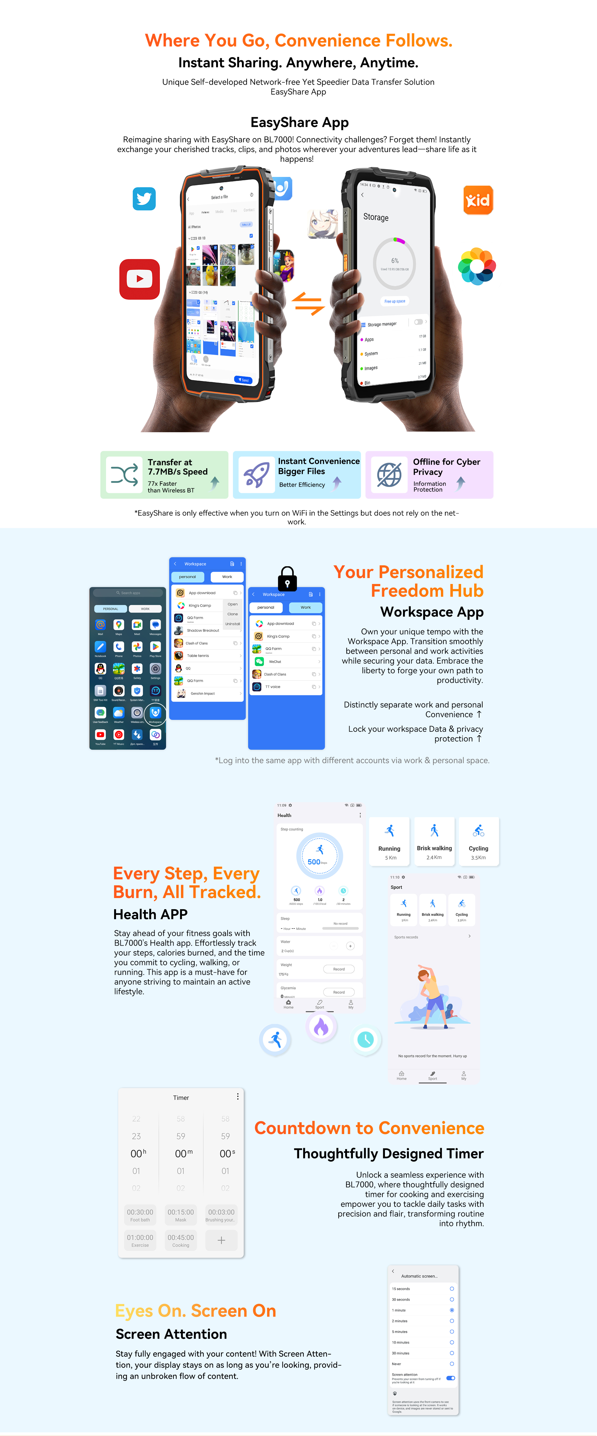 Glove Mode,Operational from -20℃ to +60℃,smart-PA BOX speakers,Face ID & Fingerprint unlock, MIL-STD-810H & Leading IP68 & IP69K Waterproofness, ToolBag utility