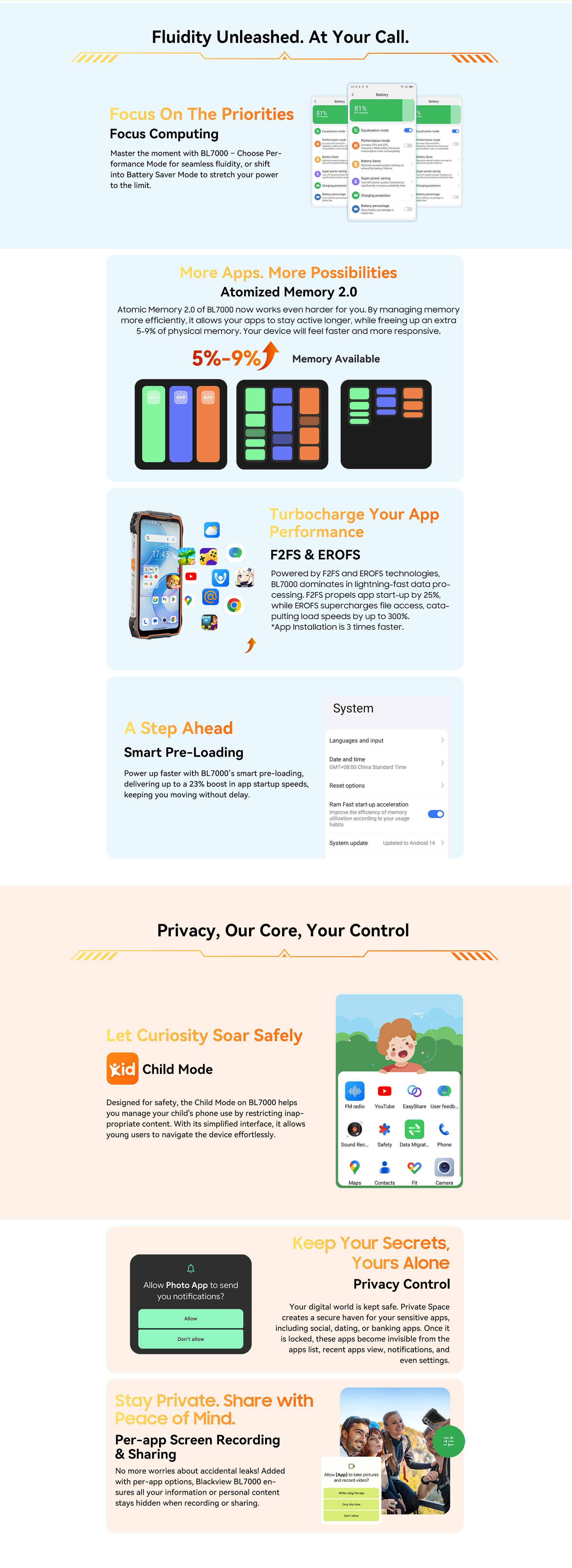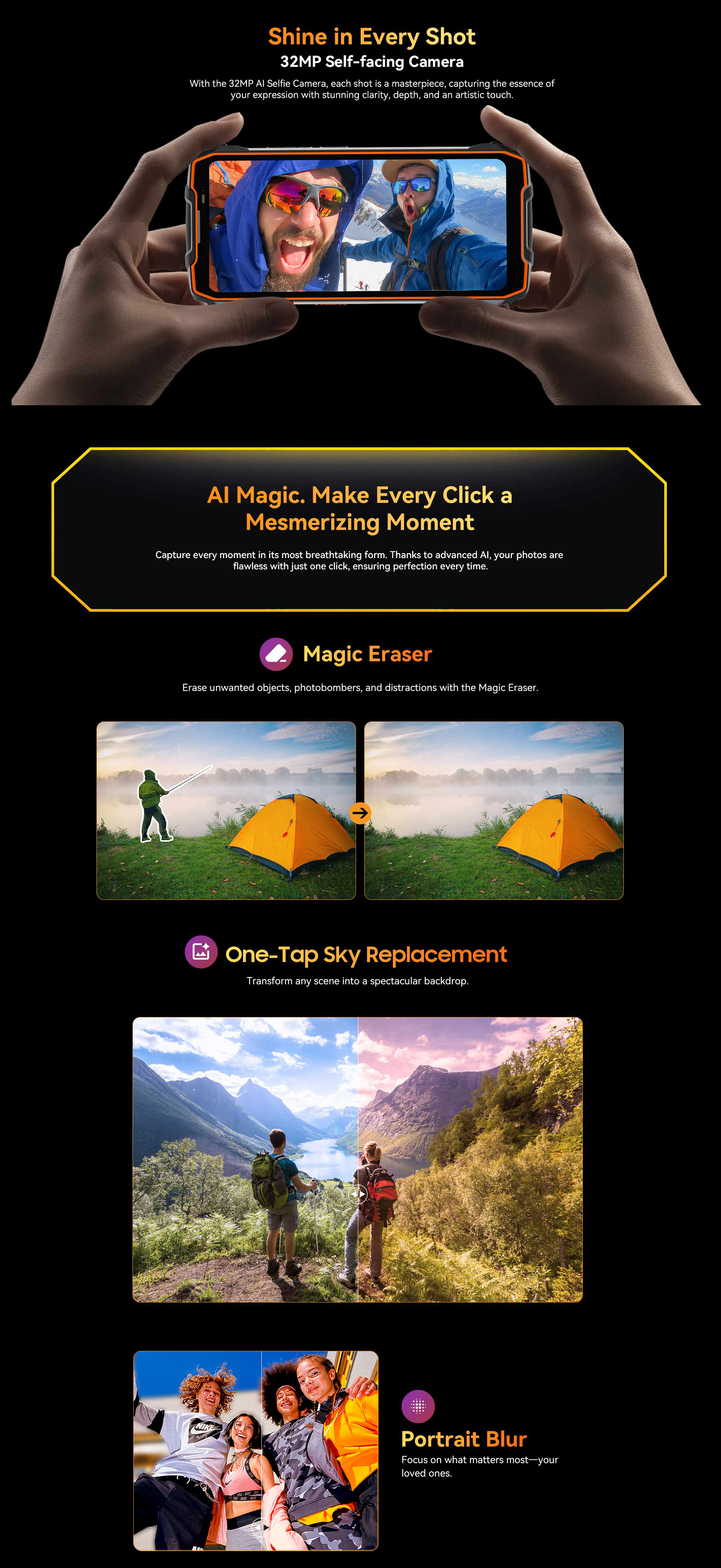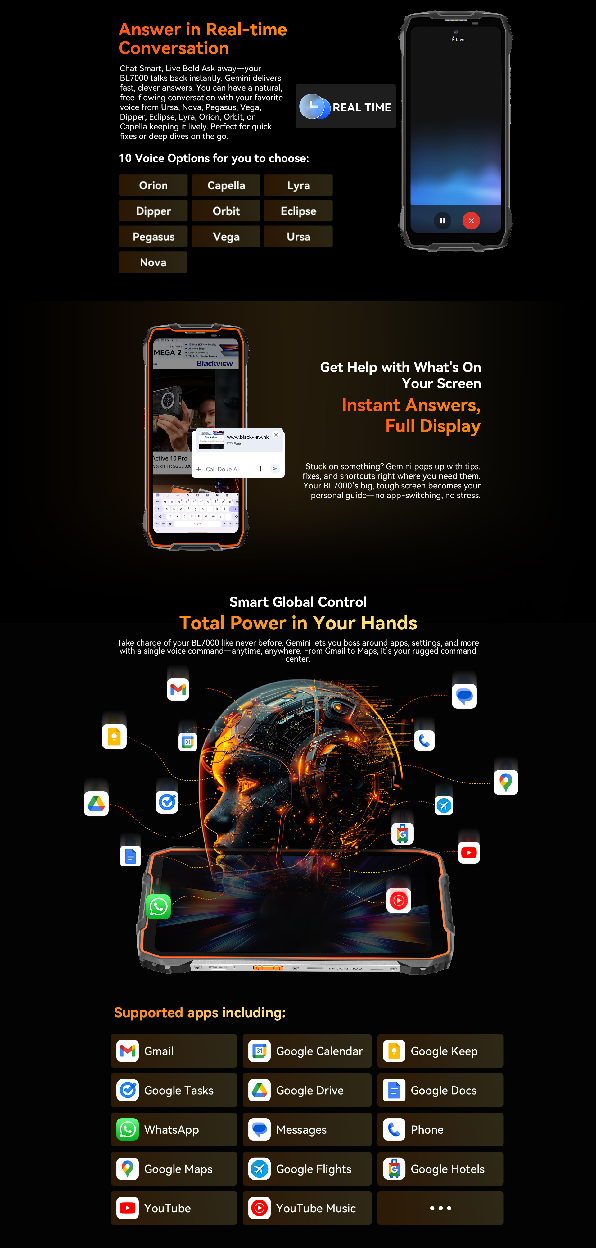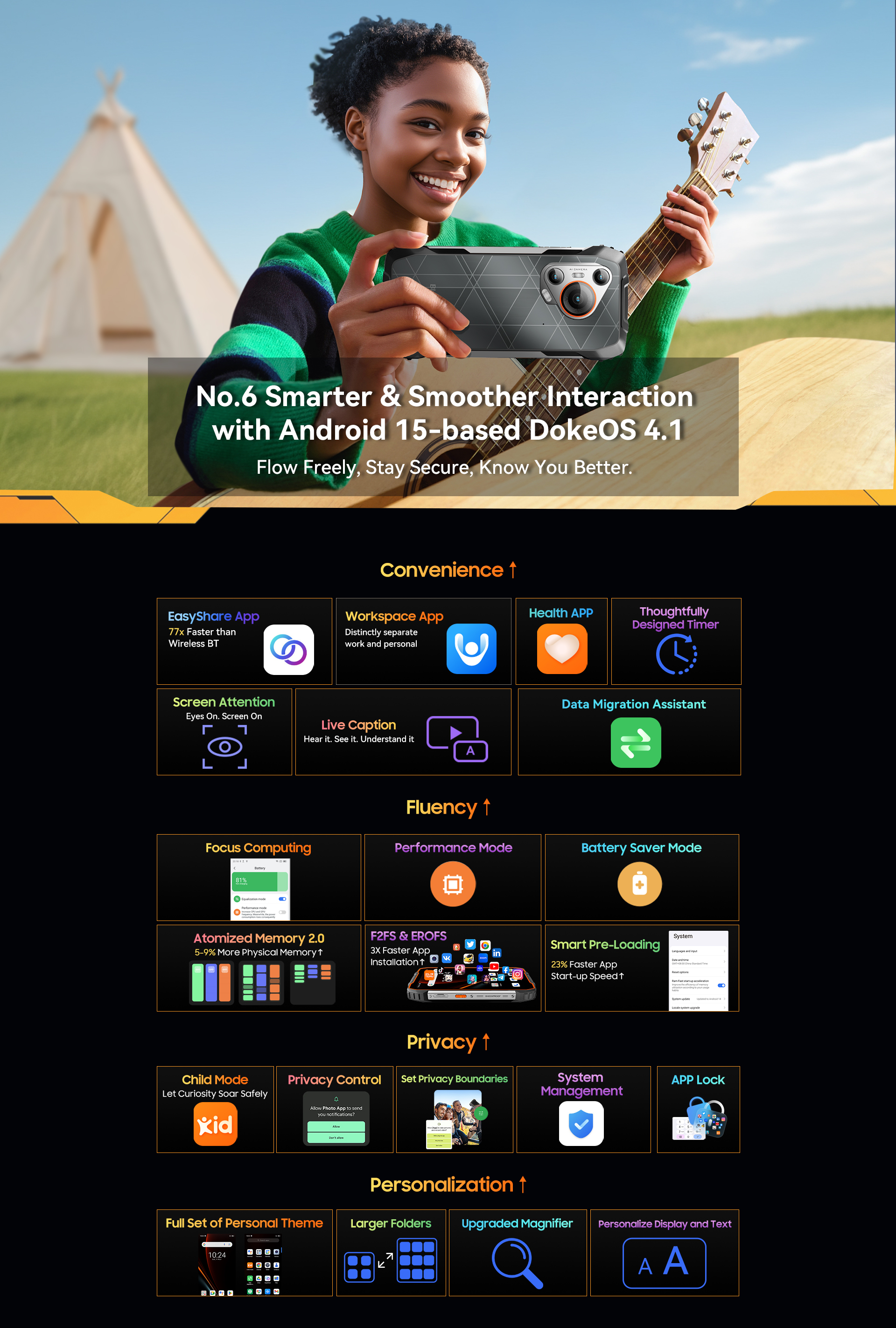 Glove Mode,Operational from -20℃ to +60℃,smart-PA BOX speakers,Face ID & Fingerprint unlock, MIL-STD-810H & Leading IP68 & IP69K Waterproofness, ToolBag utility
