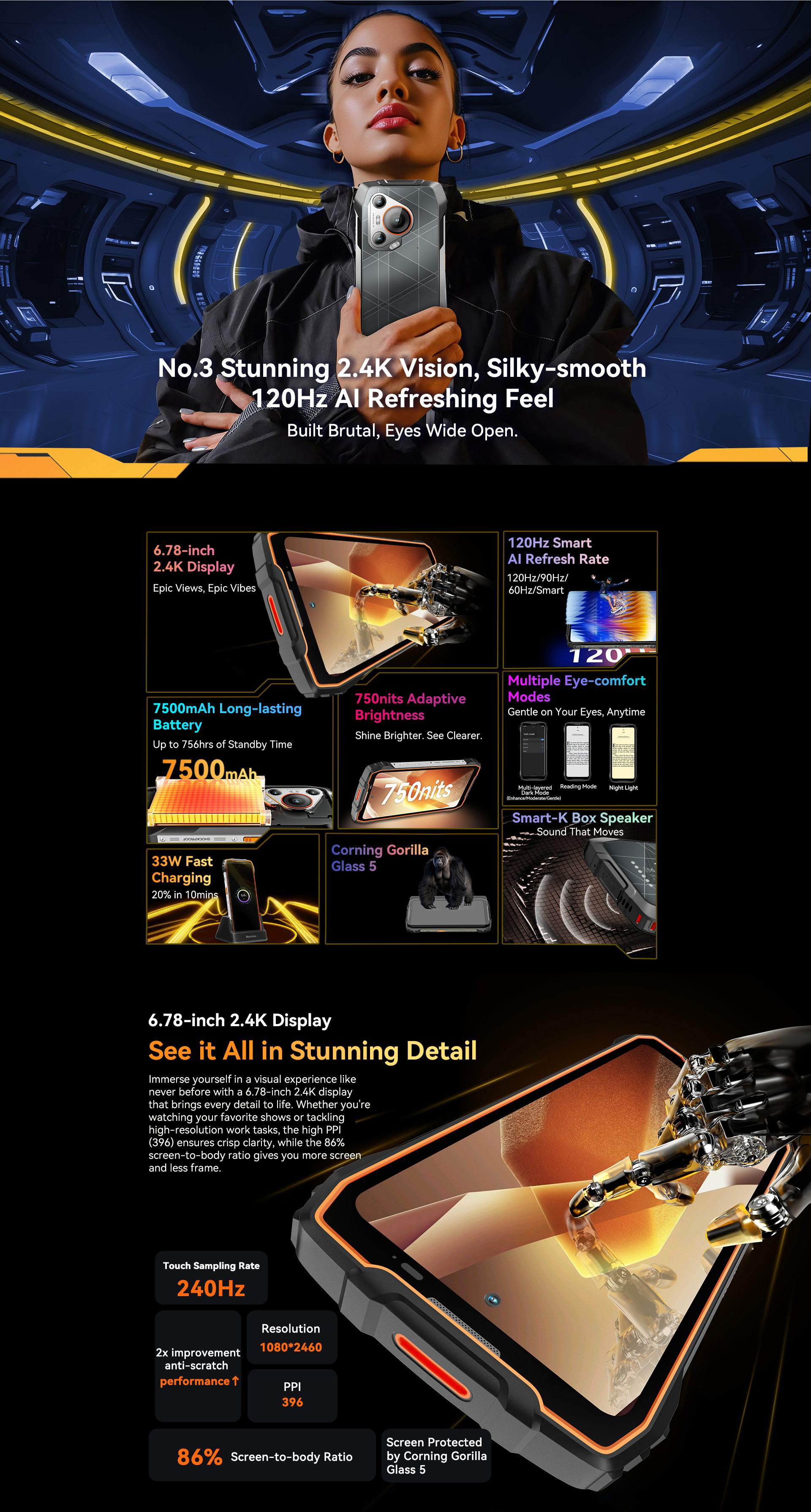 Screen --------6.78" 1080x2460, 2.4K Display, 120Hz AI Smart Refresh Rate (120Hz/90Hz/60Hz/Auto)