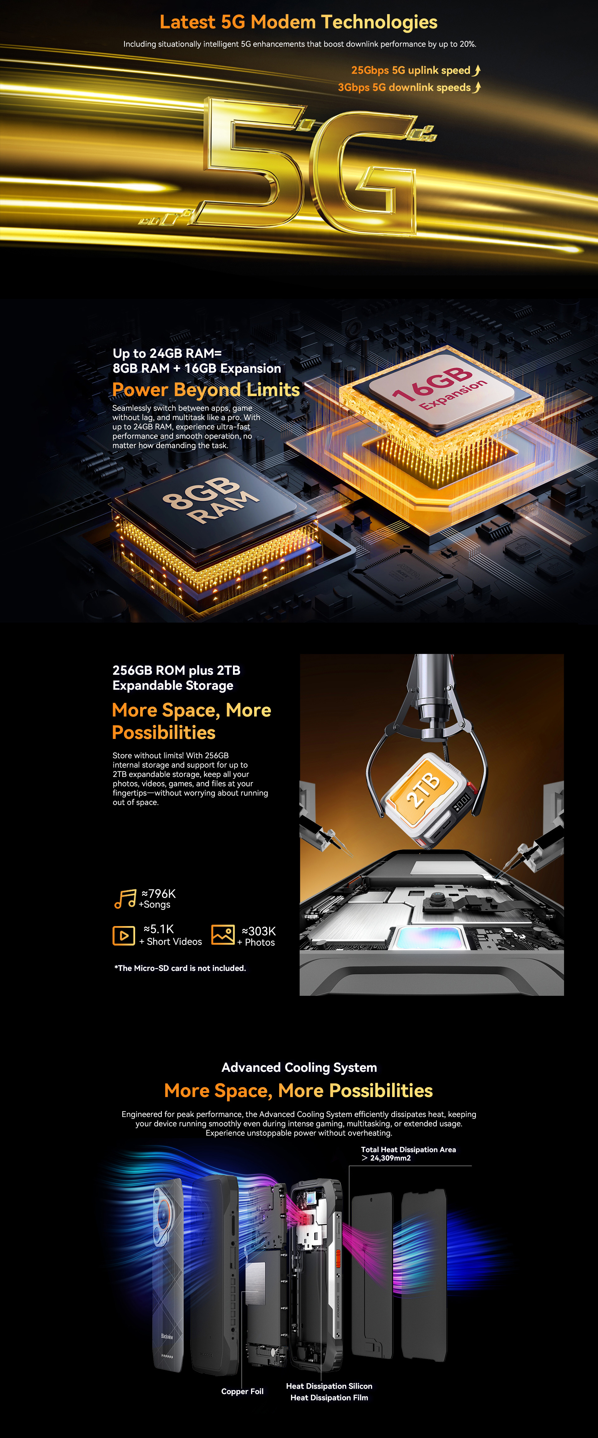ROM-------256GB+ Supports SD expandable storage up to 2TB (TF Card not included) ≈796K+ songs/303K+ photos/5.1K+ short videos