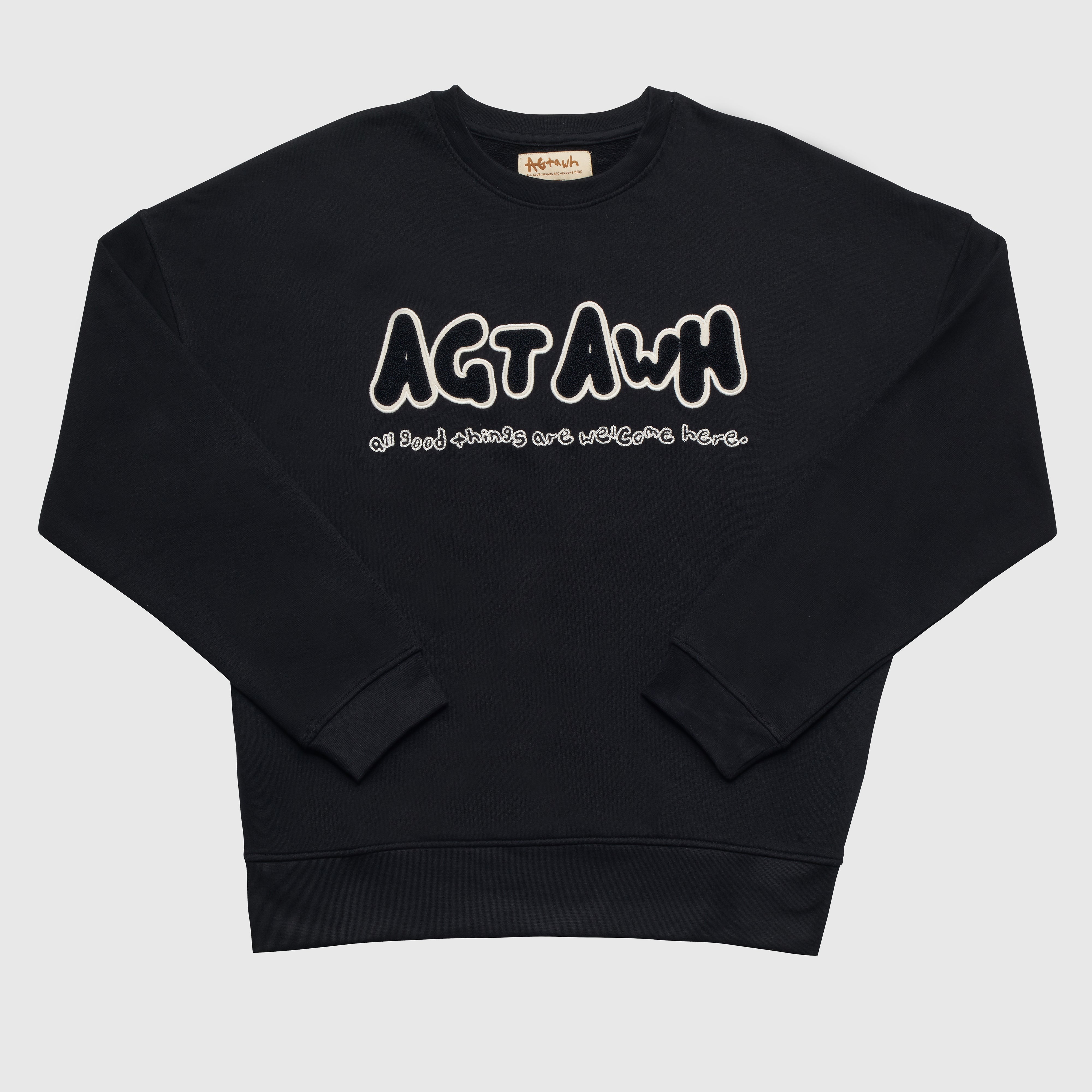 All Good Things Are Welcome Here Classic Sweatshirt with embroidery and chenille patch Color: Black Material: 100% Cotton French Terry 300 GSM Machine wash cold with like colors. Do not bleach. Tumble Dry low. Cool iron if needed. Ribbed Crew Neck Ribbed Hems Embroidered Logo