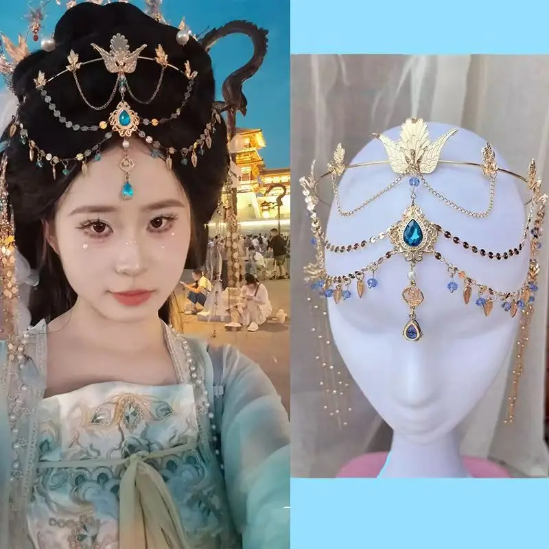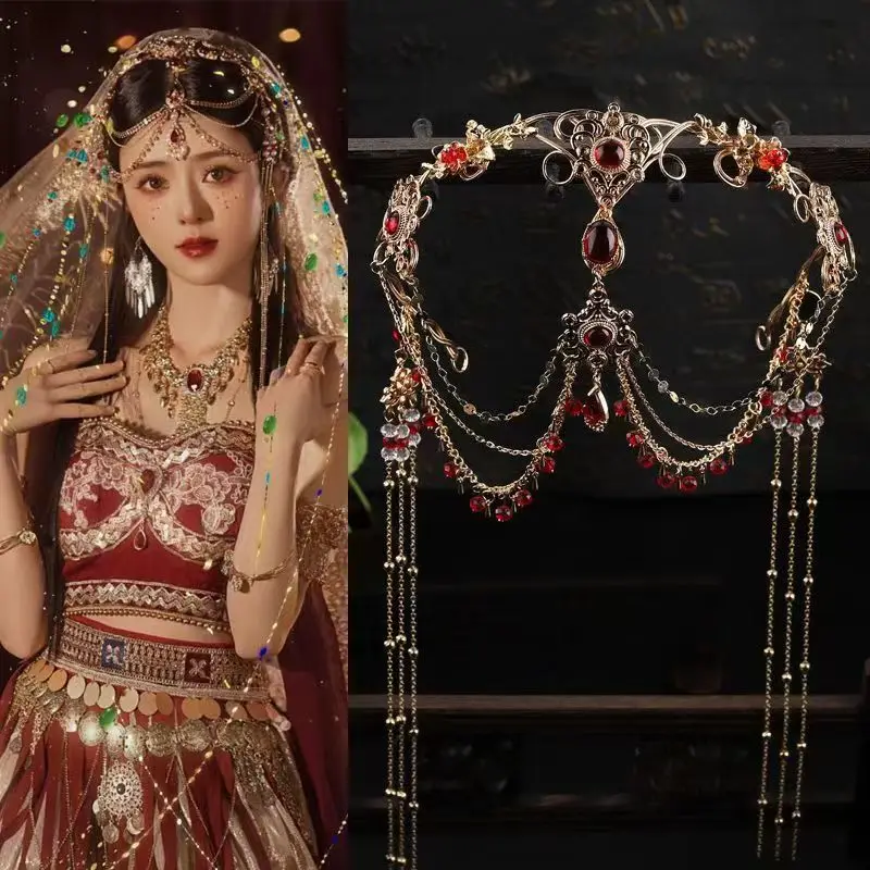 Princess Forehead Exotic Dancer Headpiece with Tassels,Chinese Hanfu Hair Accessories for Women Bridal Boho Festival Costume Decoration