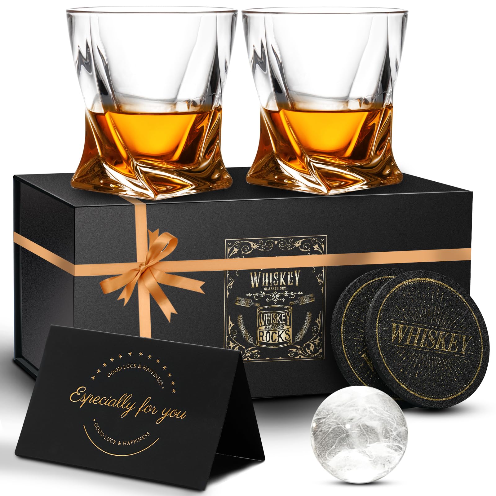 Whiskey Gift Set: 2 Ice Ball Molds, 1 Greeting Cards, 2 Coasters, 2 x 11 OZ crystal whisky glasses, 1 x 80 inch Ribbon. Simply pre-fill the ice ball moulds with water and place in the freezer, then add 1 full ice ball to the glass and enjoy the refreshing taste anytime.Modern yet timeless set of 2 whiskey glasses that you can use for home, bar, restaurant, party, wedding banquet, relax time and business occassions
