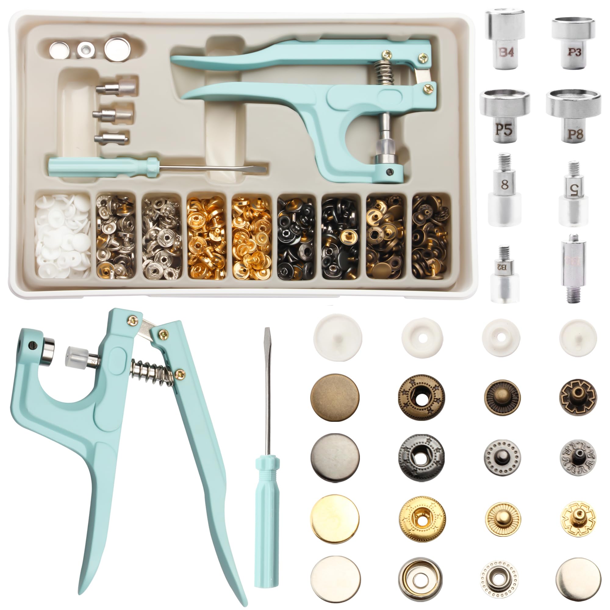 WHAT YOU GET:120 SETS of 4 different colors of metal snap buttons and 20 sets of plastic buttons, including hand press pliers, 5 piece setting tools.