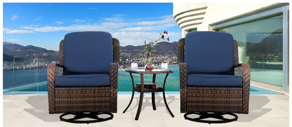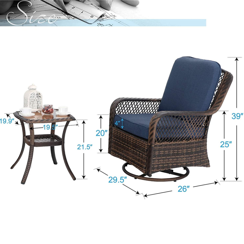 Special Design: 360-degree swivel performing chairs with gentle rocking ability. The outdoor sofa set features generous, extra deep seat, creating the superior comfort. 360 degree full motion sofa gives you an enjoyable and cozy feeling Overall size(fully assembled): Swivel chair: W26" x L29.5" x H39", Coffee Table: W19.5" x L19.5" x H21.5" Occasions: Ideal for any outdoor space including yards, patios, gardens, porches, balcony or indoors if you want. Enjoy eating, gaming or sun bath with friends or family on this set. Rust and weather resistant. Perfect for outdoor activities Material: Powder coated stable steel frame,rust and weather resistant. All weather-resistant PE wicker. Quick-drying deep seat cushions are covered in a high-performance spun polyester fabric that allows for superior durability and colorfastness in all types of outdoor settings. Stable and breakage-proof tempered glass table top Assembly & Maintenance: Easy to assemble with clear instructions and all necessary accessories included. We try to pack patio furniture as good as we can. If there is any part missing or damaged during shipping, please contact us. We will solve the problem as the way you want. Padded cushions with removable covers allow for easy cleaning and maintenance Product Package 2 x Single armrest chair with cushions 1 x Table 1 x Instruction About UsWelcome to our modern_patio store. Our company specializes in selling home garden tables and chairs, sets, tents, beach camping and indoor bar stools, kitchen furniture, and office desk and chair series furniture. Quality Products: All of our items come with a 30-Day money back guarantee, and have been chosen from various reputable manufacturers. Our products are also tested for quality assurance purposes, and provide 1 year warranty. We believe that it is our vision and mission to provide innovative products to meet your needs with the best service and competitive prices. Our goal is to make sure you find exactly what you're looking for and make it easy for you to place your order. Payment1. We accept payment methods : PayPal, Payoneer, Visa, Master Card, American Express , Discover and Credit Card, etc. 2. Payment should be completed within 3 days of auction closing. Or unpaid dispute will be filed for closing auction. 3. If for some reason there is any issue with the purchase, please contact us prior to leaving feedback, and we will be glad to work with you to have it resolved. Shipping1. Most of the goods will be dispatched within 1-3 working days after confirming payment or settlement. 2. We ship UPS/FedEx/USPS depending on your location. 3. Please make sure the Ship-To address you type during checkout is correct, orders will be shipped out to the shipping address provided by eBay. We are not responsible for any wrong address. Contact UsIf you have any questions or concerns about the product or the auction, please contact our customer service department via email or send us message on eBay my messages. We will give you a response in 24 hours. Returns1. All of our items come with a 30-day return policy. We ensure all our items are new and in excellent condition prior to shipping. In the event that you receive the item that is not to the standards above, please contact us via eBay messages. All returns must be in new original condition as received and should be shipped with delivery confirmation. 2. If you need to return, please check twice to confirm the item not work and contact our customer service representative, let us know the detailed problem and send us some pictures for confirmation. 3. We ONLY accept the return for original package. Please make sure that item has NO man-made sabotage. Used items will not be accepted for return. Helpful Links |