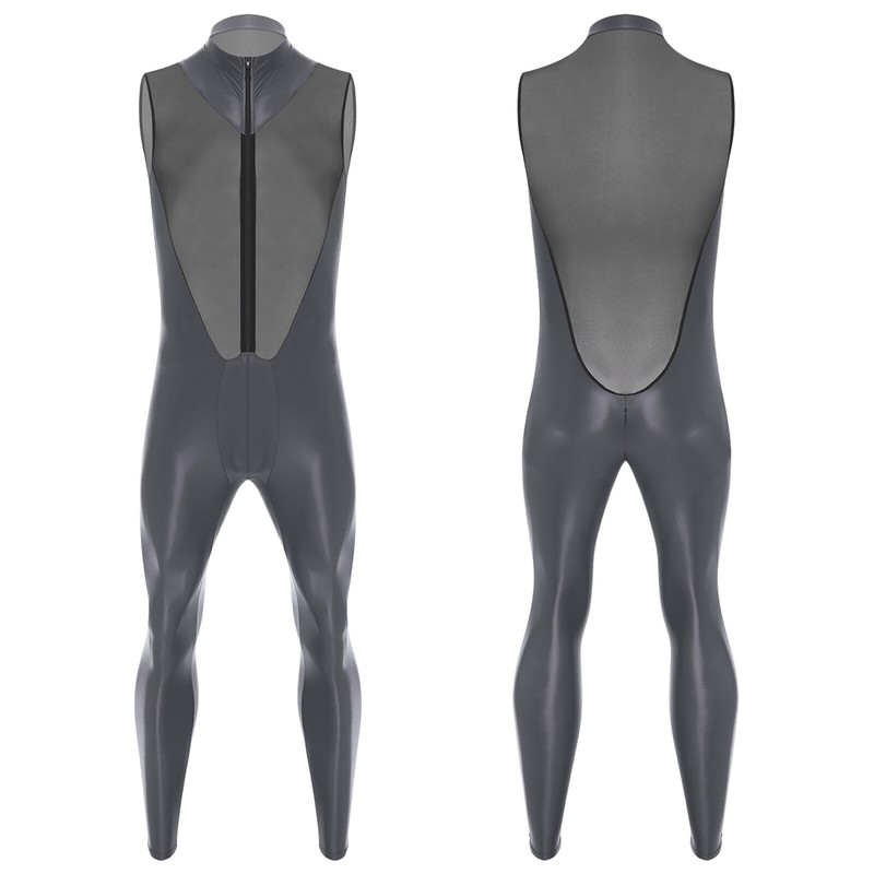 Sleeveless, deep u neck and back with a zipper in the front, see through sheer mesh design, high cut legs.