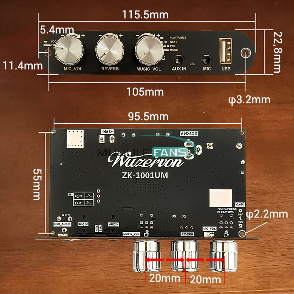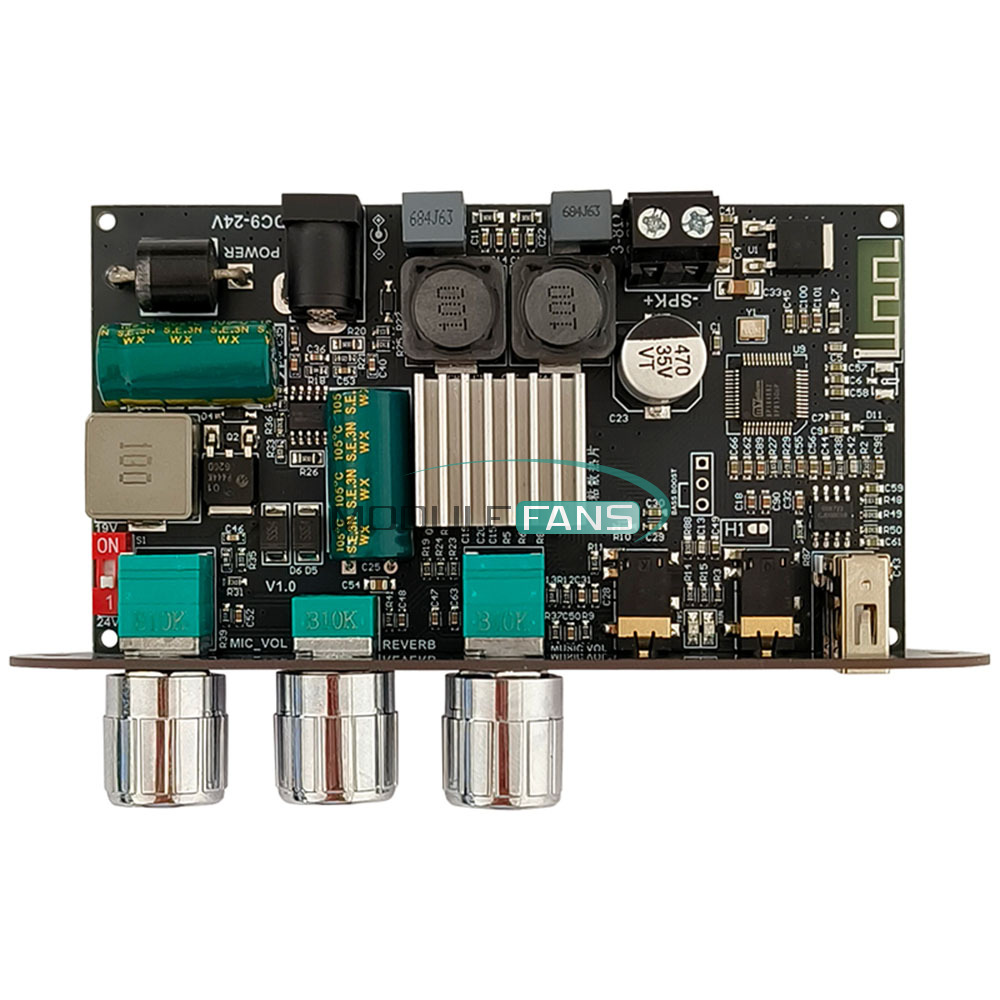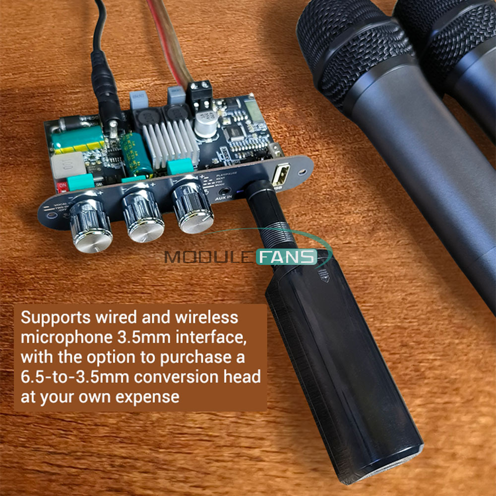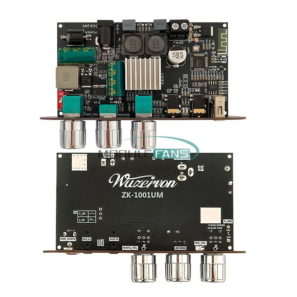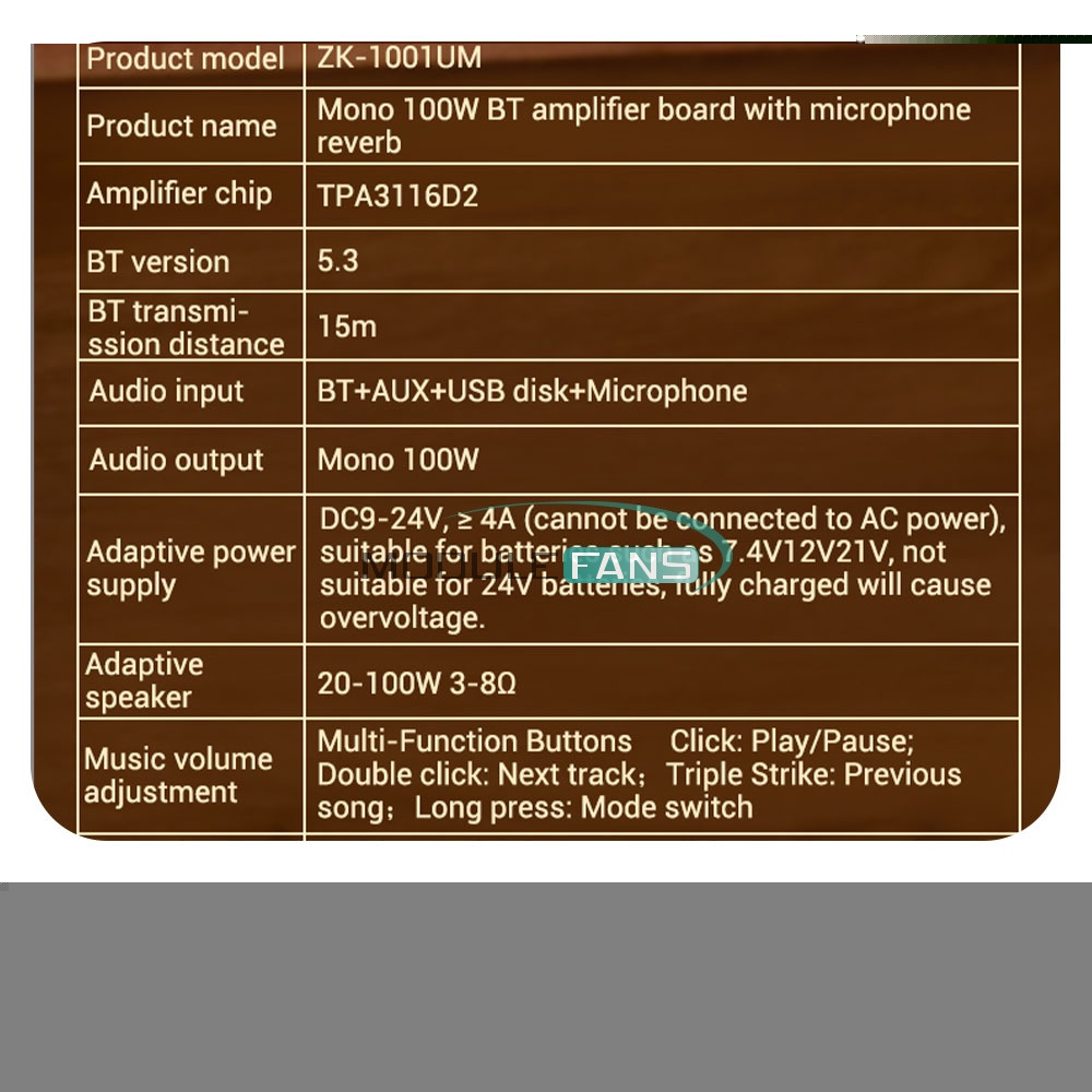 Product Parameters Model No.: ZK-1001UM Product Name: Mono 100W Bluetooth Amplifier Board with Microphone Reverb Amplifier Chip: TPA3116D2 Bluetooth Version: 5.3 Bluetooth Transmission Distance: 15 meters Audio Input: Bluetooth+AUX+U disk+Microphone Audio Output: Mono 100W Adaptable Power Supply: DC9-24V, ≥4A (can not be connected to the AC power), suitable for 7.4V12V21V and other batteries, not suitable for 24V batteries, fully charged will be over-voltage. Adaptable Speaker: 20-100W, 3-8Ω