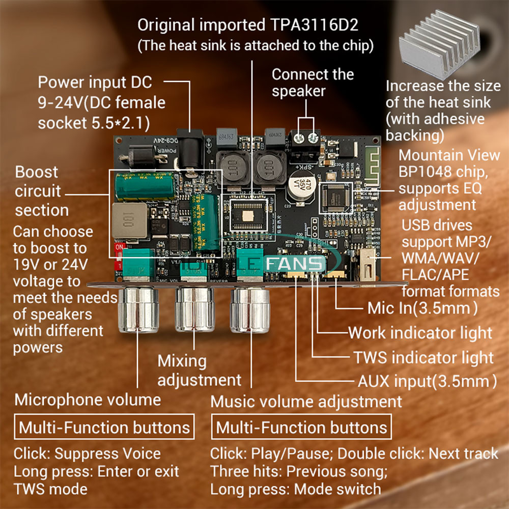 Product Features: 1.Support karaoke microphone reverb function, bring professional grade sound experience. 2. Built-in boost circuit, adapt to a variety of voltages, flexible response to different scene requirements. 3. TPA3116 amplifier chip, strong output 100W mono power. 4.Support TWS to box function, create immersive stereo sound field effect. 5.Bluetooth 5.3 connection is stable, support lossless decoding and PC EQ fine adjustment.