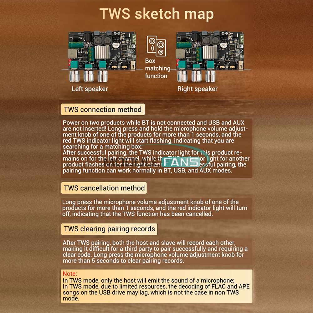 Protection mechanism: input anti-reverse, over-temperature, over-current, short-circuit, anti-static protection Special features: pair box function, true wireless function so that the two sets of speakers can be combined to become the left and right channel pair box, the sense of spatial positioning is stronger. Product size: 99x75x22.8mm