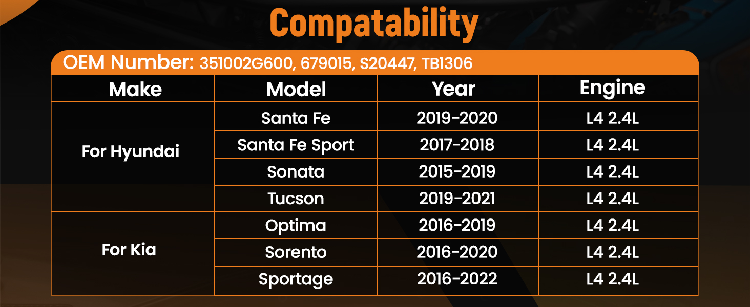 | For Hyundai | Santa Fe Sport | 2.4L 2359CC l4 GAS DOHC Naturally Aspirated | Base Sport Utility 4-Door | 2017 | EBay compatibility is for reference only. Please check the dimensions before the purchasing. |