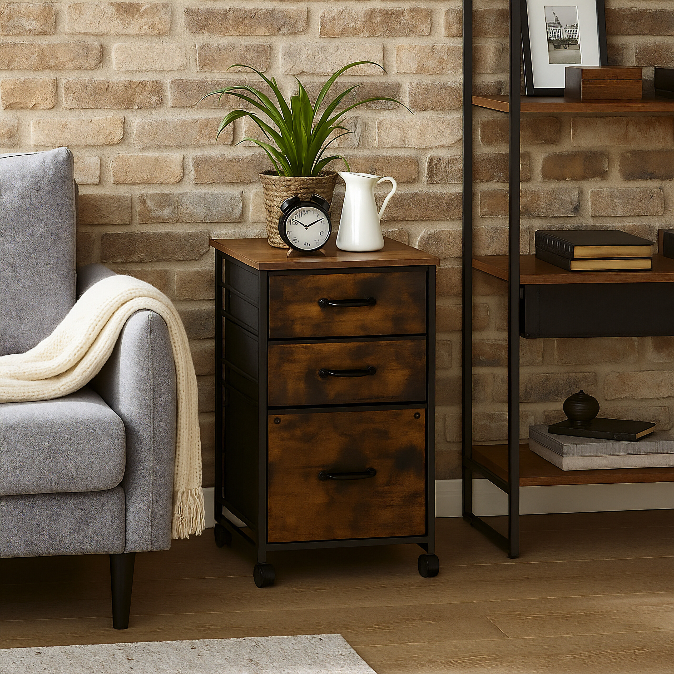 Efektywna praca zaczyna się od odpowiedniego wyposażenia. Szafka biurowa posiada 2 płaskie szuflady oraz 1 szufladę z zawieszkami na dokumenty formatu DIN A4 lub Letter. Pionowe rozmieszczenie oraz składany blat zapewniają dobry przegląd i szybki dostęp do zawartości. Dzięki 4 kółkom szafka na segregatory jest łatwa do przesuwania, a 2 hamulce zapewniają stabilność. Styl industrialny stanowi dodatkowy, dekoracyjny element przyciągający wzrok.