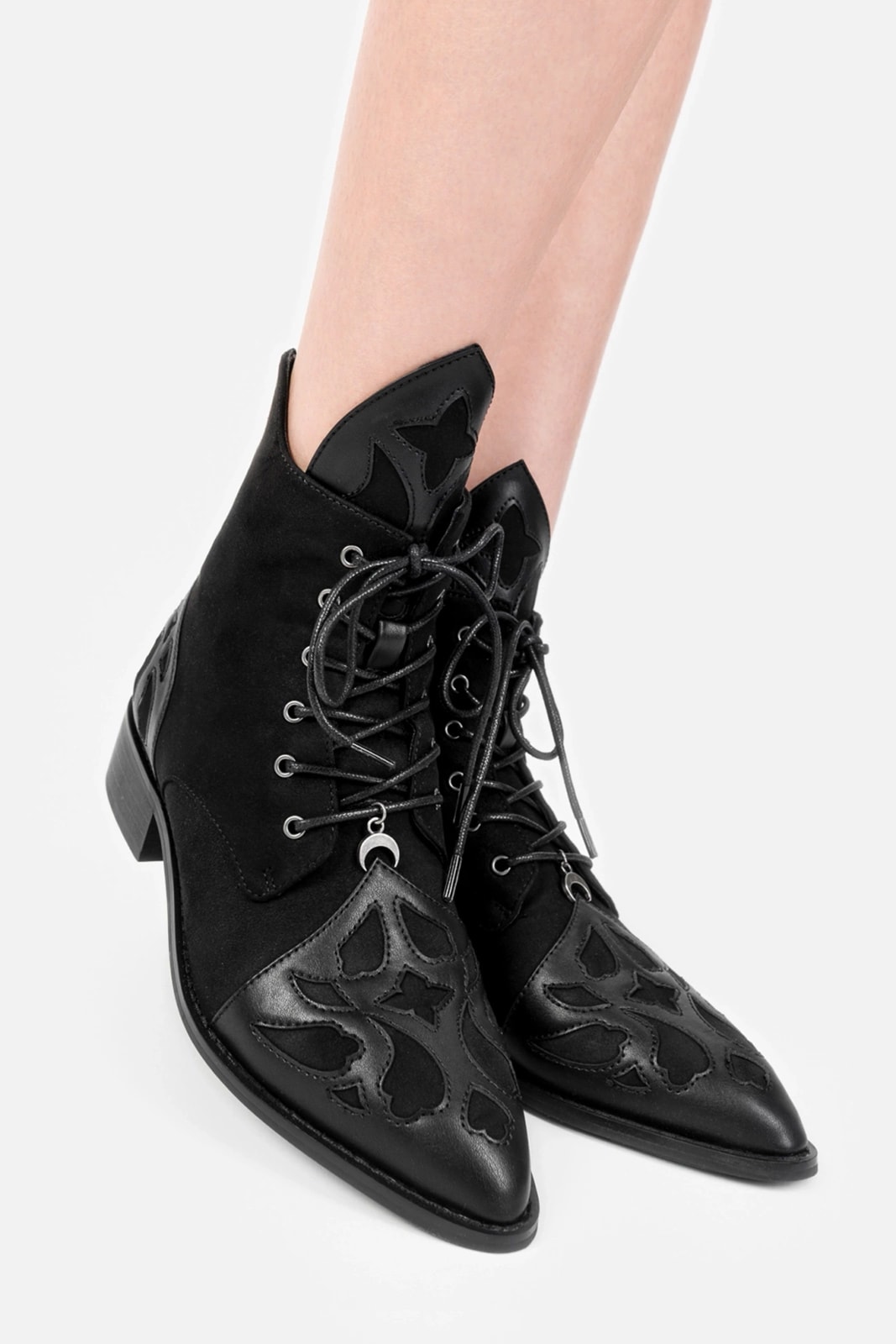 Diese Gothic-Stiefeletten aus der Cathedral Collection vereinen architektonische Eleganz mit düsterem Charme. Die spitze Zehenpartie und die kathedralenartigen Ausschnitte auf der Zunge verleihen dem Design eine einzigartige Note. Gefertigt aus strukturiertem Kunstleder, bieten sie nicht nur Stil, sondern auch veganfreundliche Qualität für den Alltag.