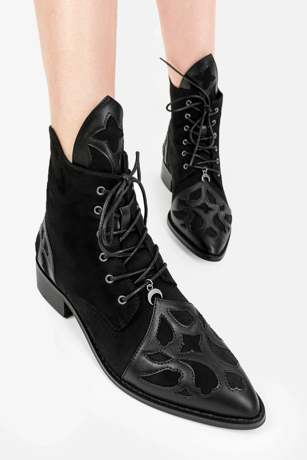Diese Stiefeletten sind perfekt für alle, die ihren Gothic-Stil mit einem Hauch architektonischer Raffinesse unterstreichen möchten.