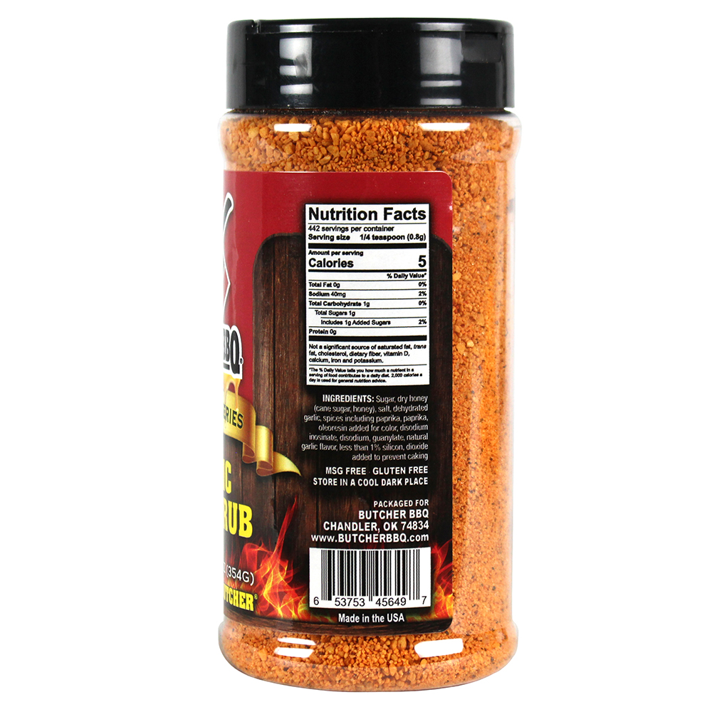 Butcher BBQ Garlic Honey Rub is a sweet and savory combination that is sure to impress. This gluten and MSG free rub is a unique blend of garlic and honey that will enhance your burgers, chicken, wild game, fish, and more with delicious and unforgettable flavor. Whether you're grilling, roasting, or barbecuing, Butcher BBQ Garlic Honey Rub is the best choice for mouthwatering flavor.