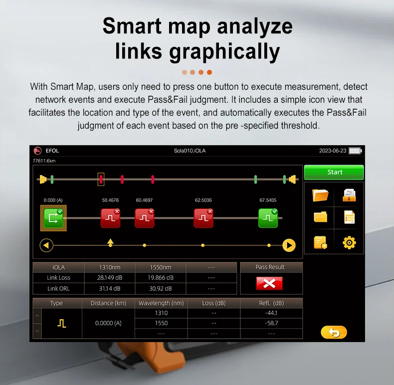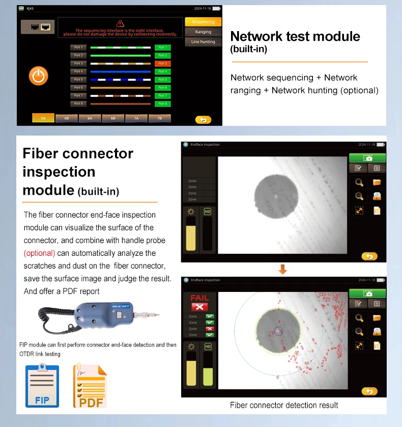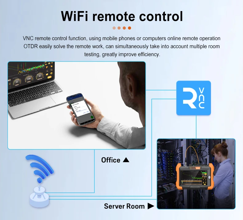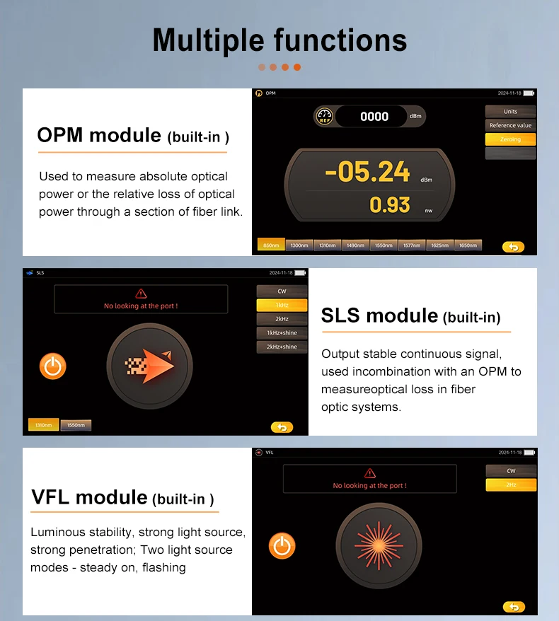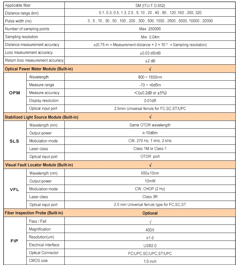 8-in-1 multi-functional OTDR: OPM /VFL/OLS /FIP/RJ45/iOLA /VNC Remote Control / GPS (just GPS is optional)