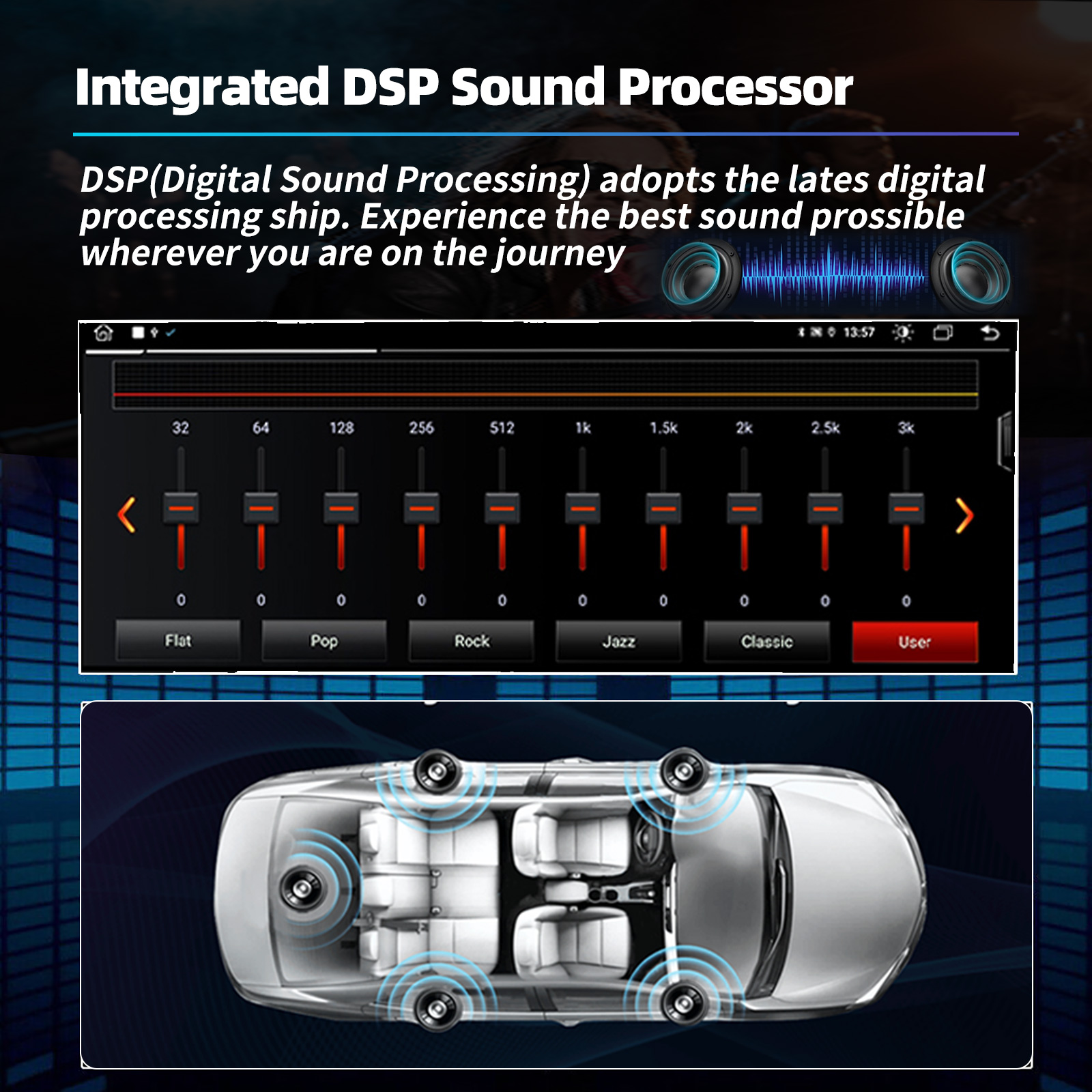 FM/AM/RDS radio, Bluetooth, and DSP sound: Supports Bluetooth 5.0, with built-in microphone, allowing you to make hands-free calls while driving. Supports access to the phonebook, music playback interface, etc. Supports RDS. You can store 18 FM and 12 AM radio stations. Built-in DSP chip. Supports 48-band EQ adjustment. With the DSP function, you can individually adjust the sound of each speaker using various equalization methods: jazz, rock, pop, classical, etc., to achieve an exceptional listening experience tailored to your personal preferences. 4 x 45W amplifier, surround sound, and subwoofer output.